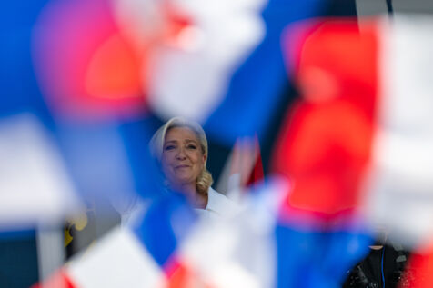 Portraits de Marine Le Pen et Jordan Bardella lors de la fête de la victoire