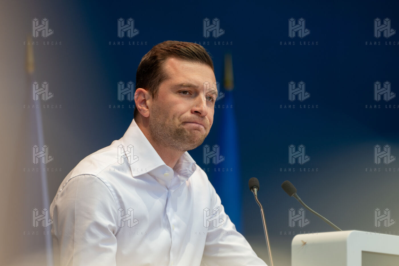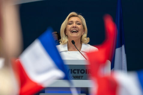 Marine Le Pen and Jordan Bardella at the victory party organised to celebrate the far-right parties' results in the 2024 European elections.
