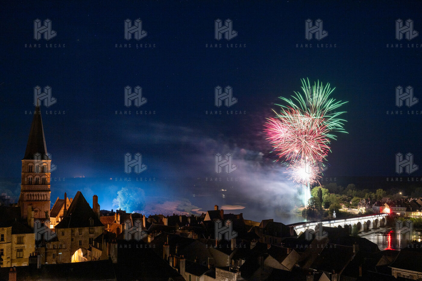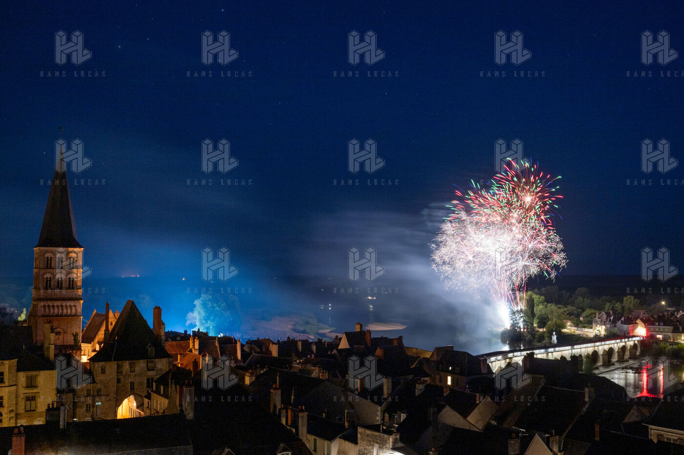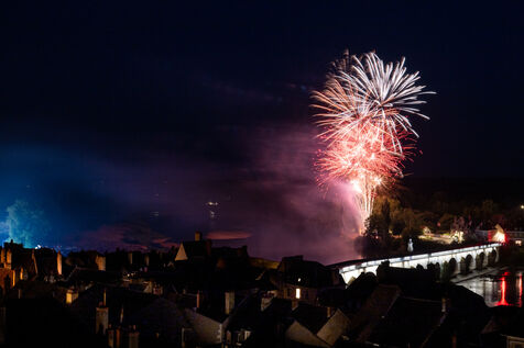 Fireworks display on 14 July along the banks of the Loire River in La Charité-sur-Loire.