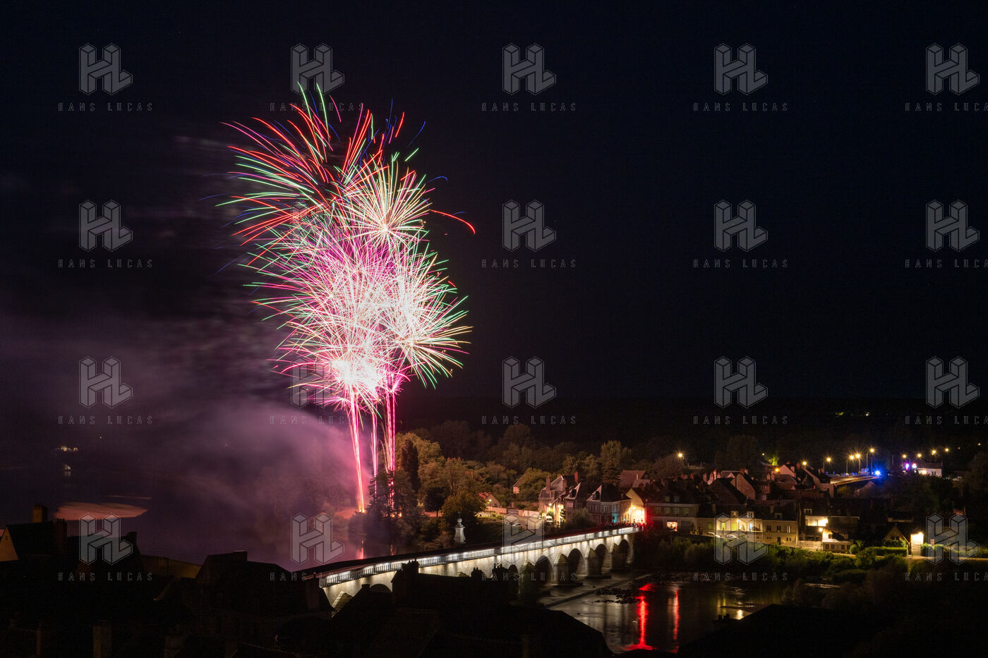Feu d'artifice du 14 juillet tiré en bord de Loire a La Charité sur Loire.