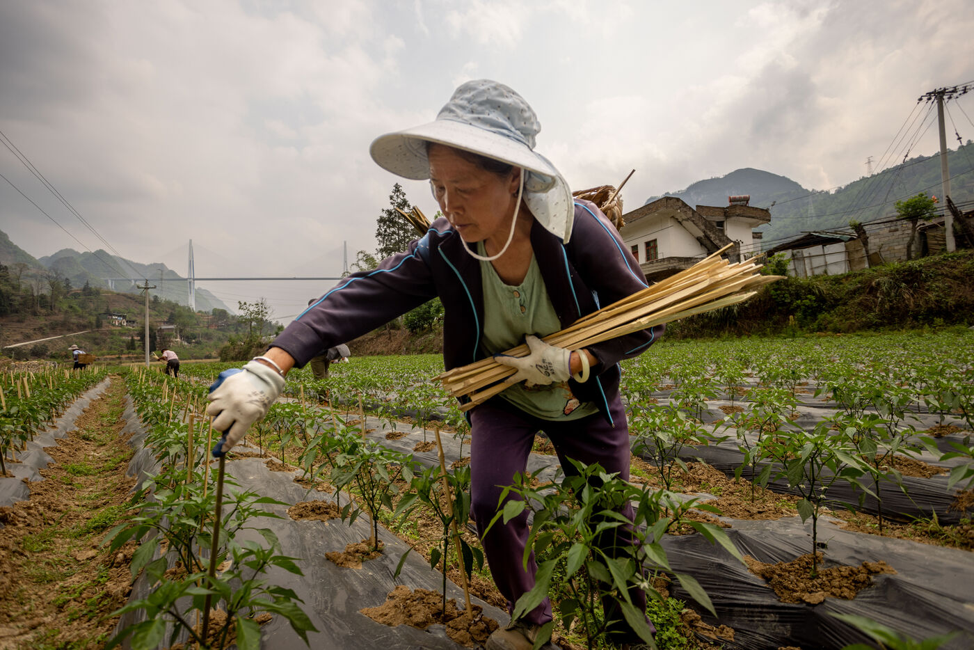 Au pied d'un super pont construit dans la province du Guizhou, les fermiers et la vie rurale est très peu affectée.