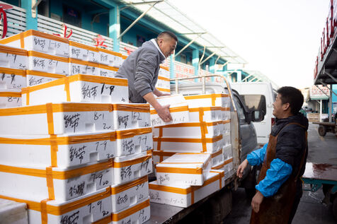 Workers at the WangSiYing Haixian fish market in Beijing are busy every day receiving hundreds of fish trucks.