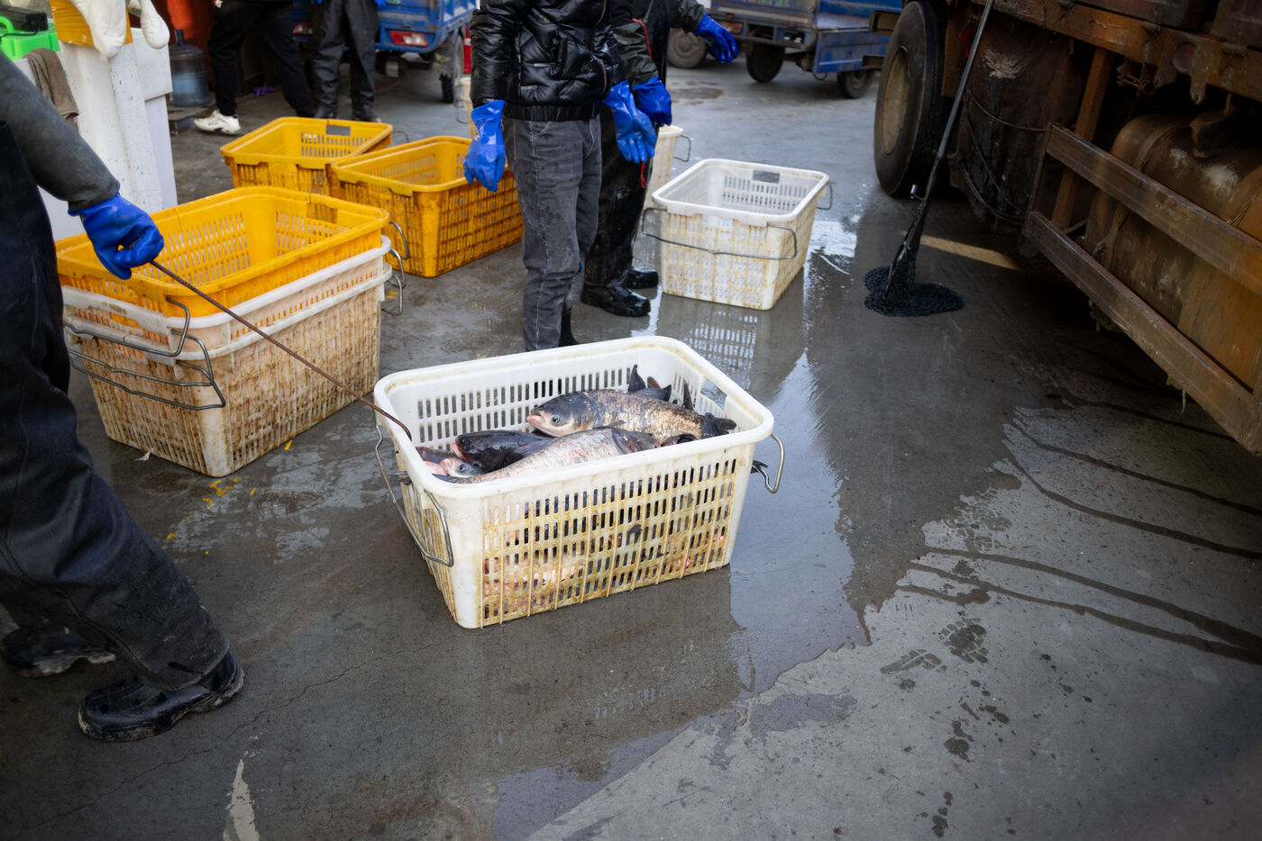 Les travailleurs du marché de poissons de WangSiYing Haixian à Beijing s'activent quotidiennement à recevoir des centaines de camions de poissons.