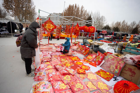 Public markets during Chinese New Year buzz with activity as shoppers eagerly snatch up vibrant decorations symbolizing good fortune. Amidst spirited vendor interactions, the atmosphere is filled with the festive energy of bargain hunting, transforming the market into a lively hub of celebration.