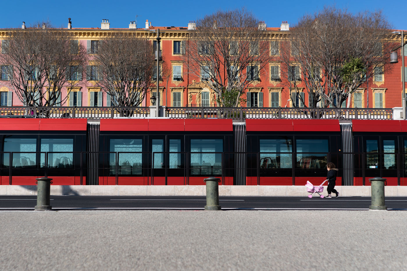 In Nice the tramway seems quite empty despite a few people waiting at the stop.