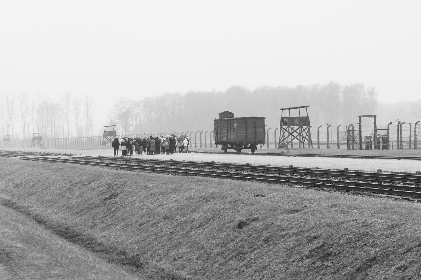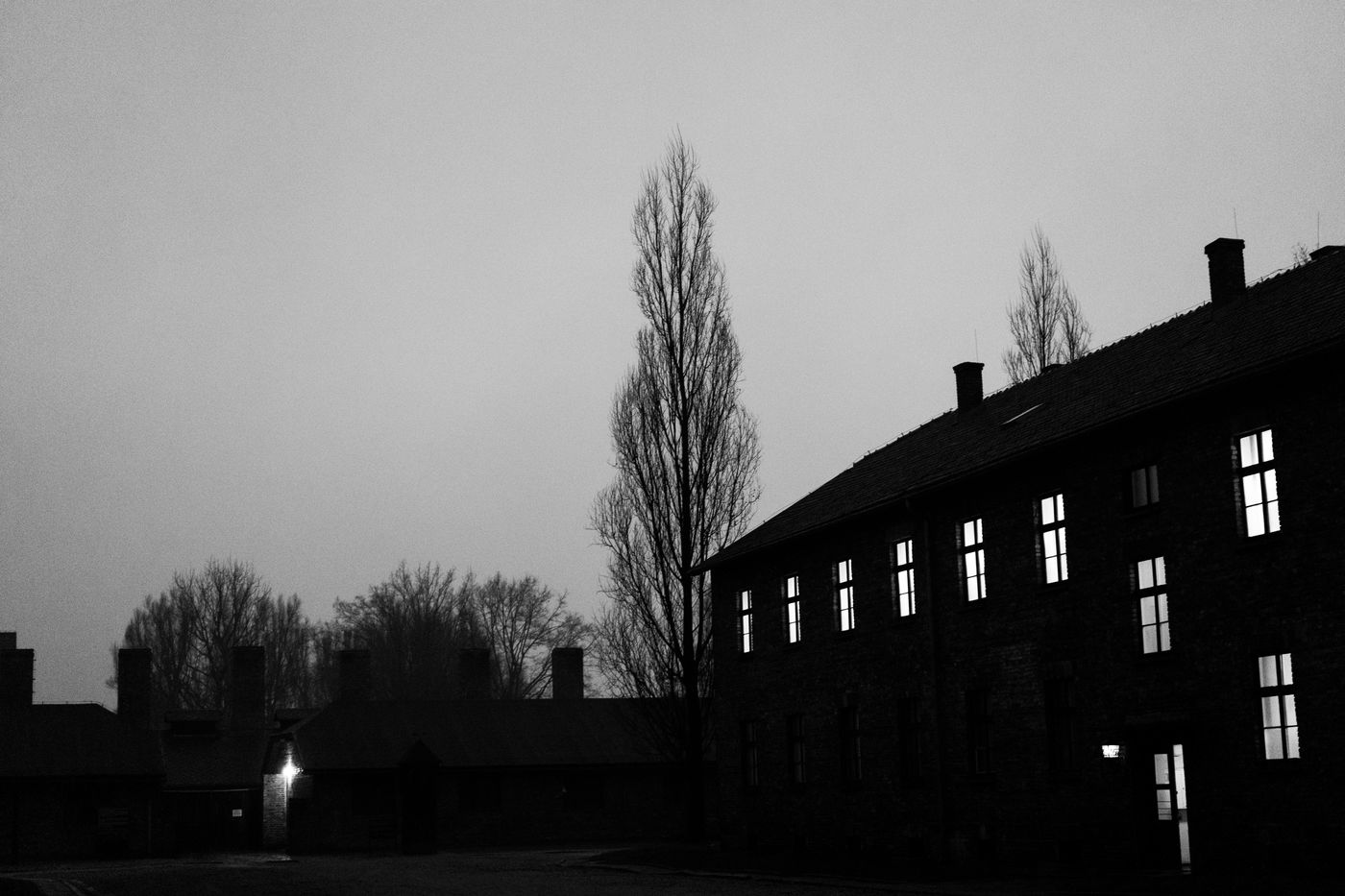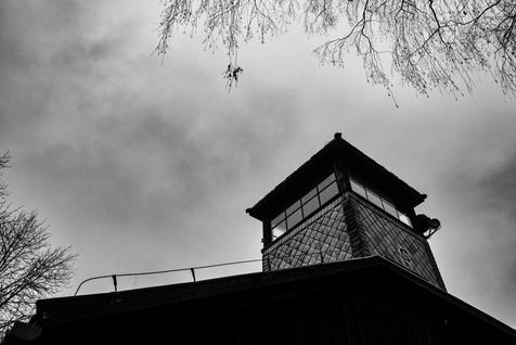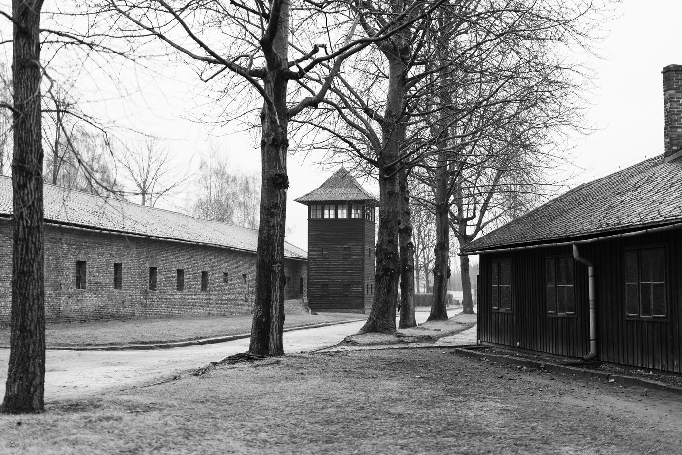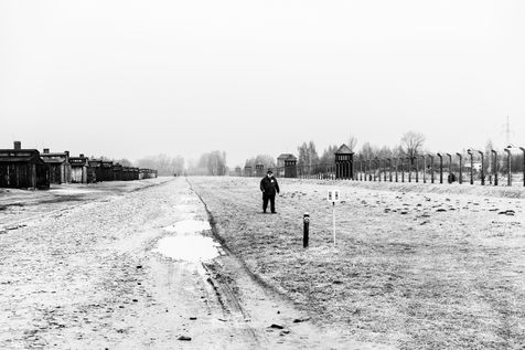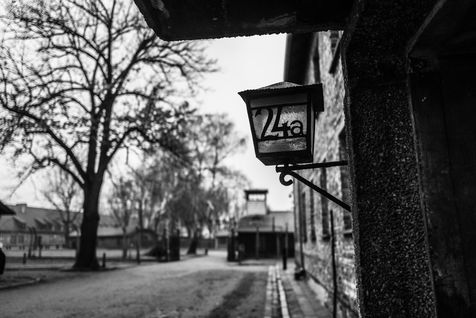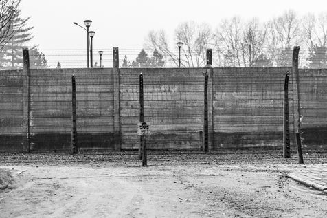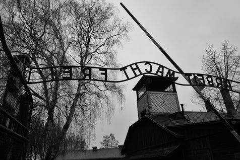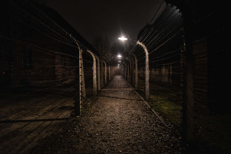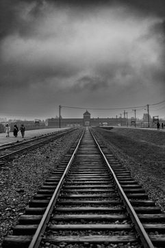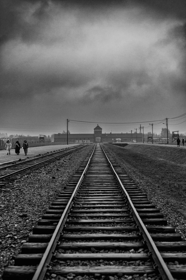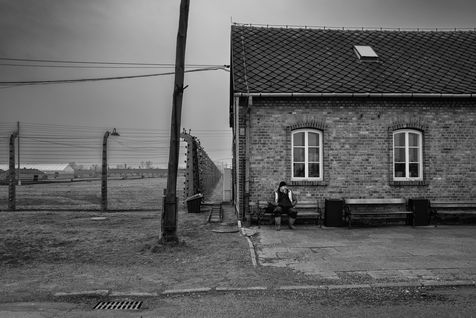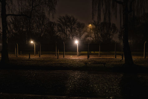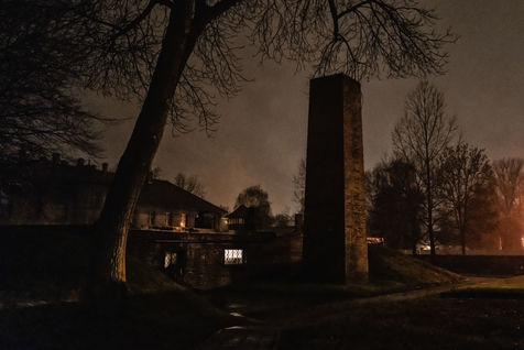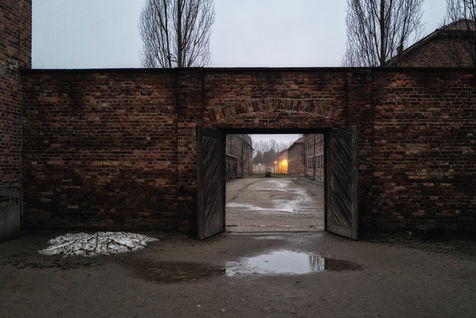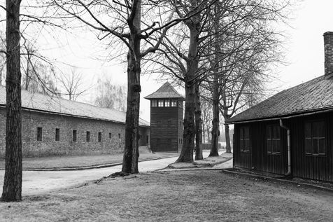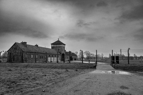 Le camp d'Auschwitz entre ombre et brouillard