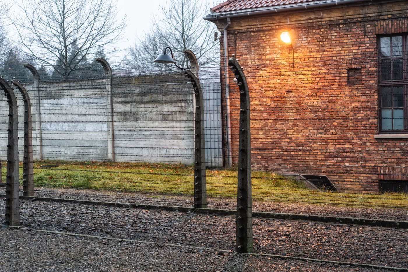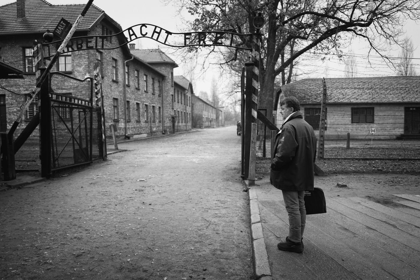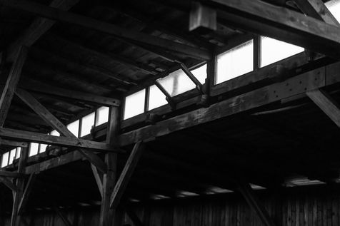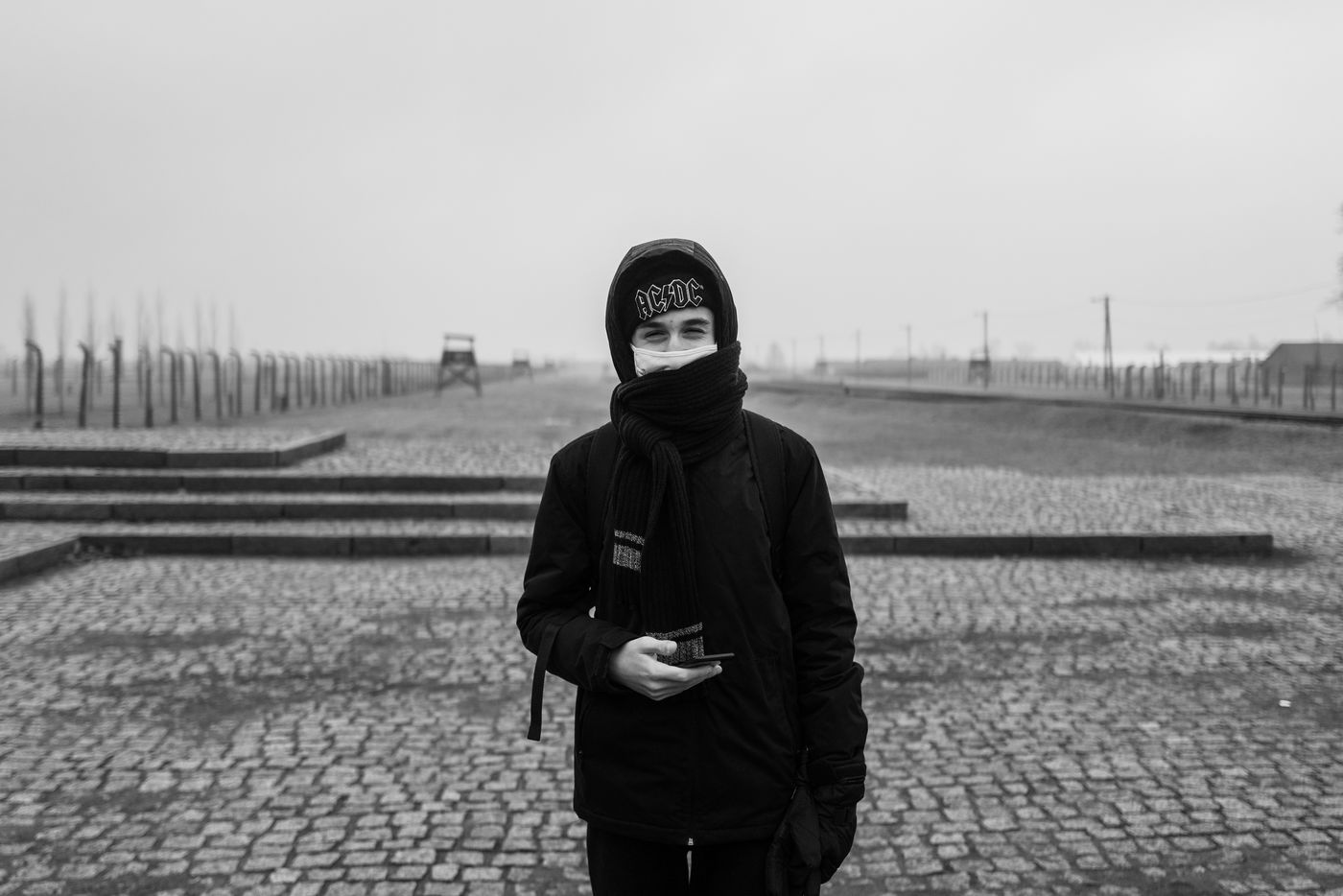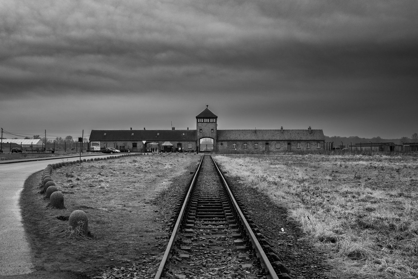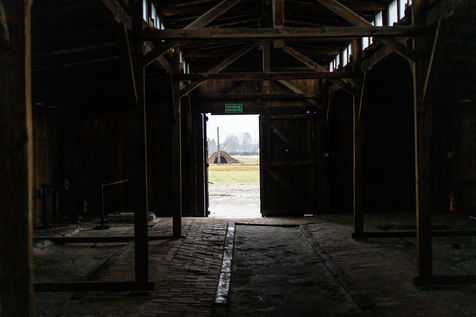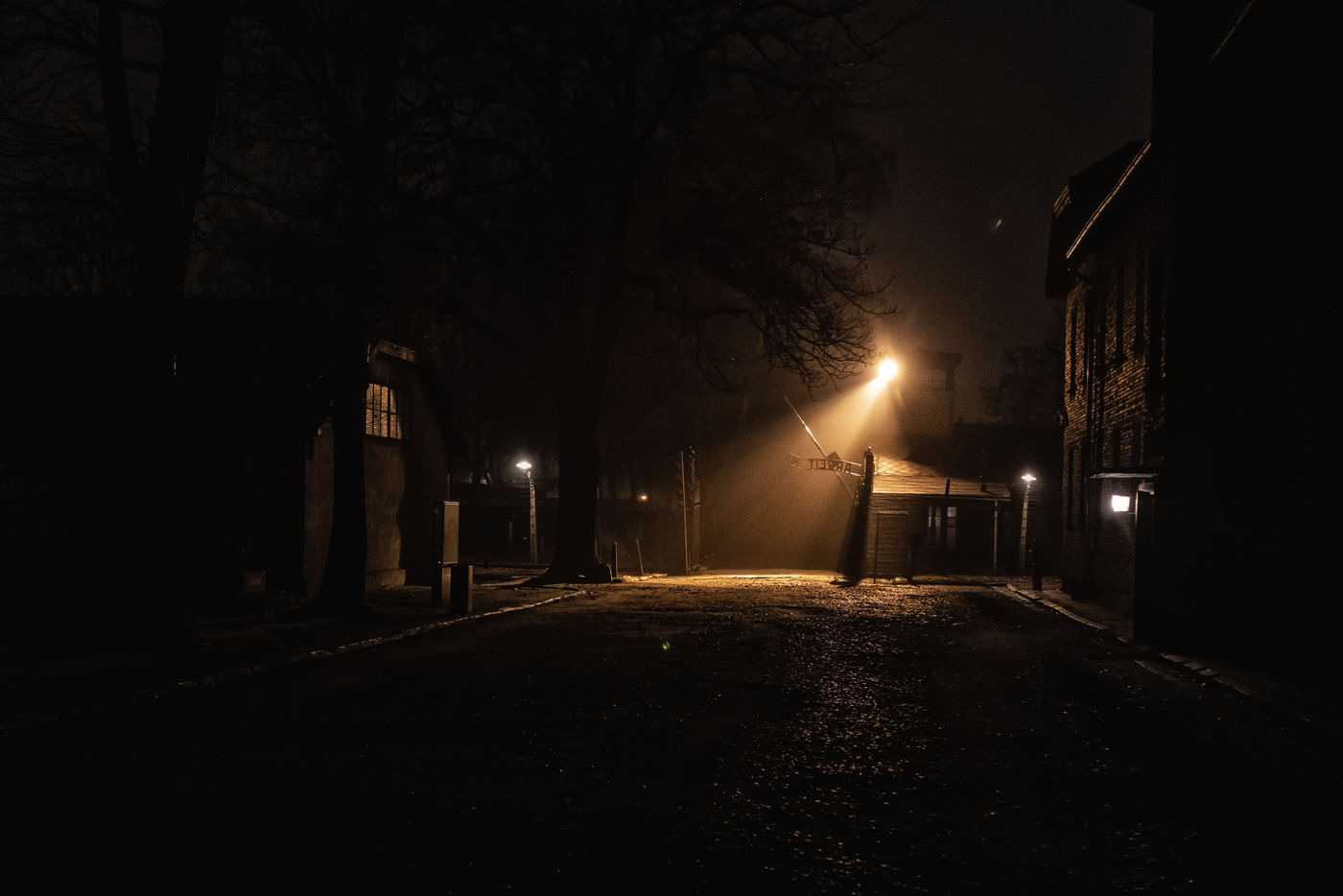 Le camp d'Auschwitz entre ombre et brouillard