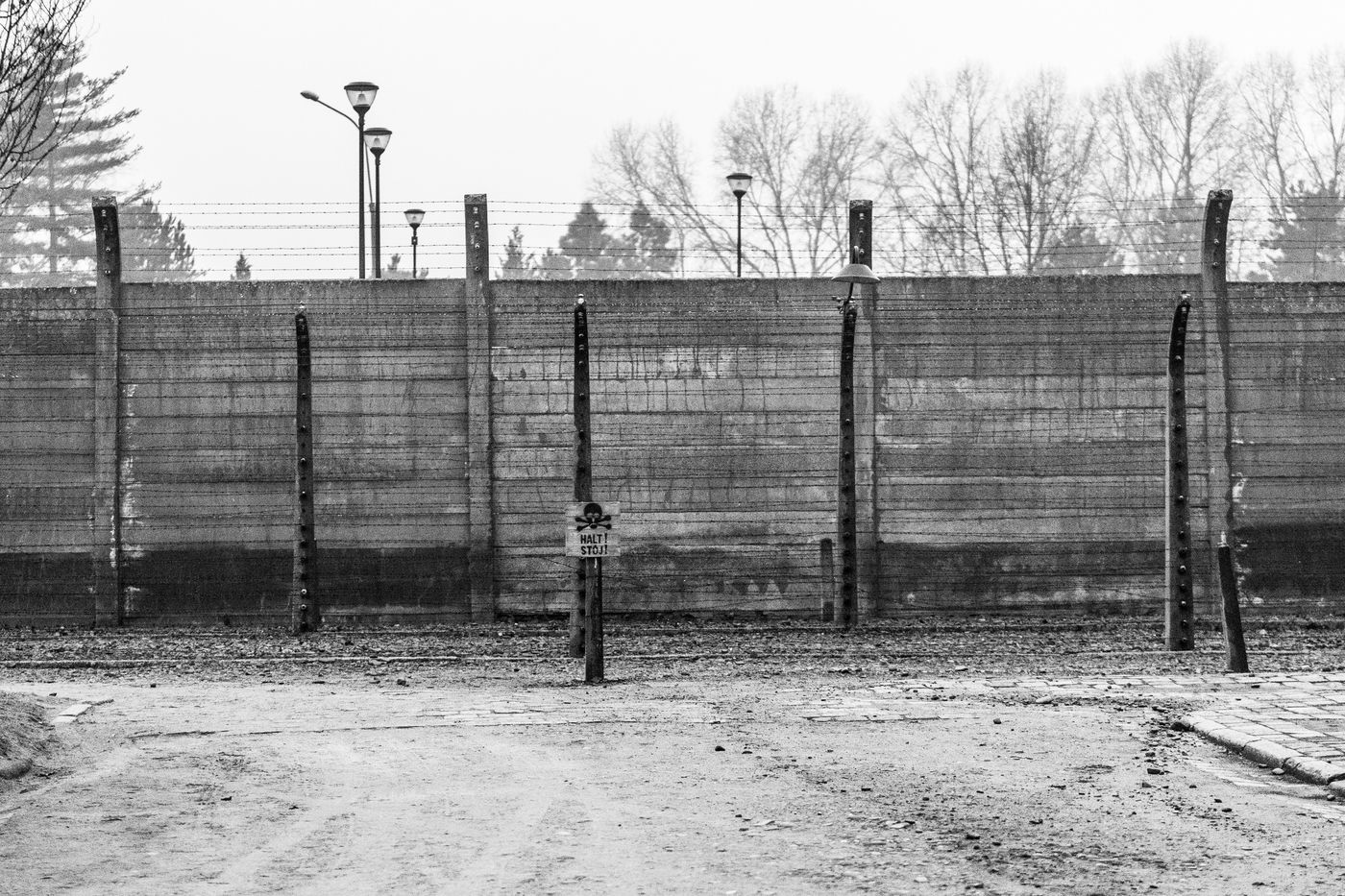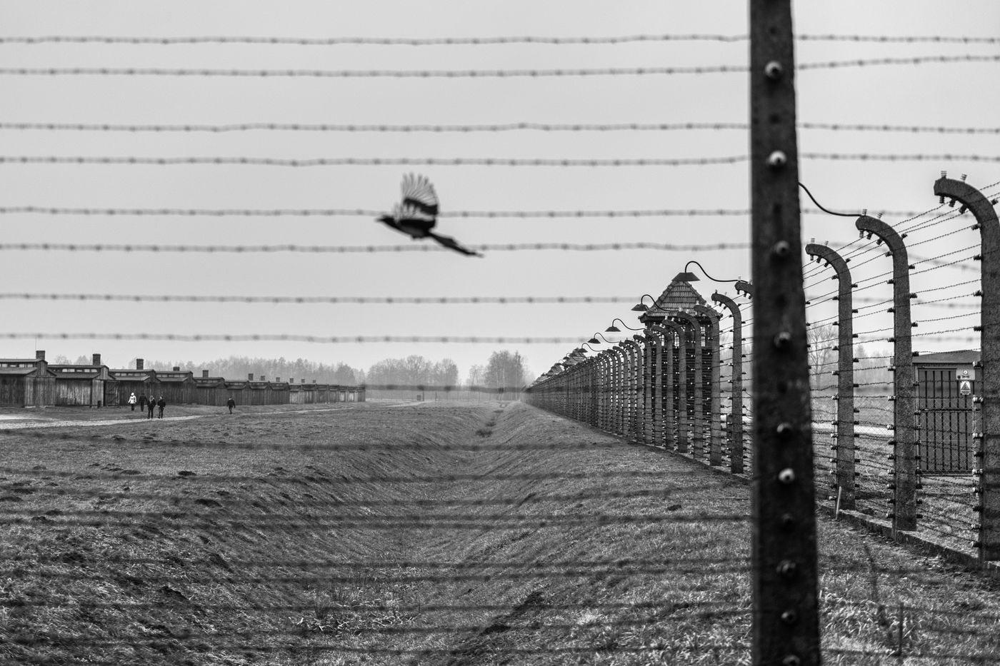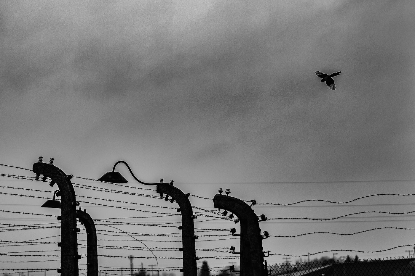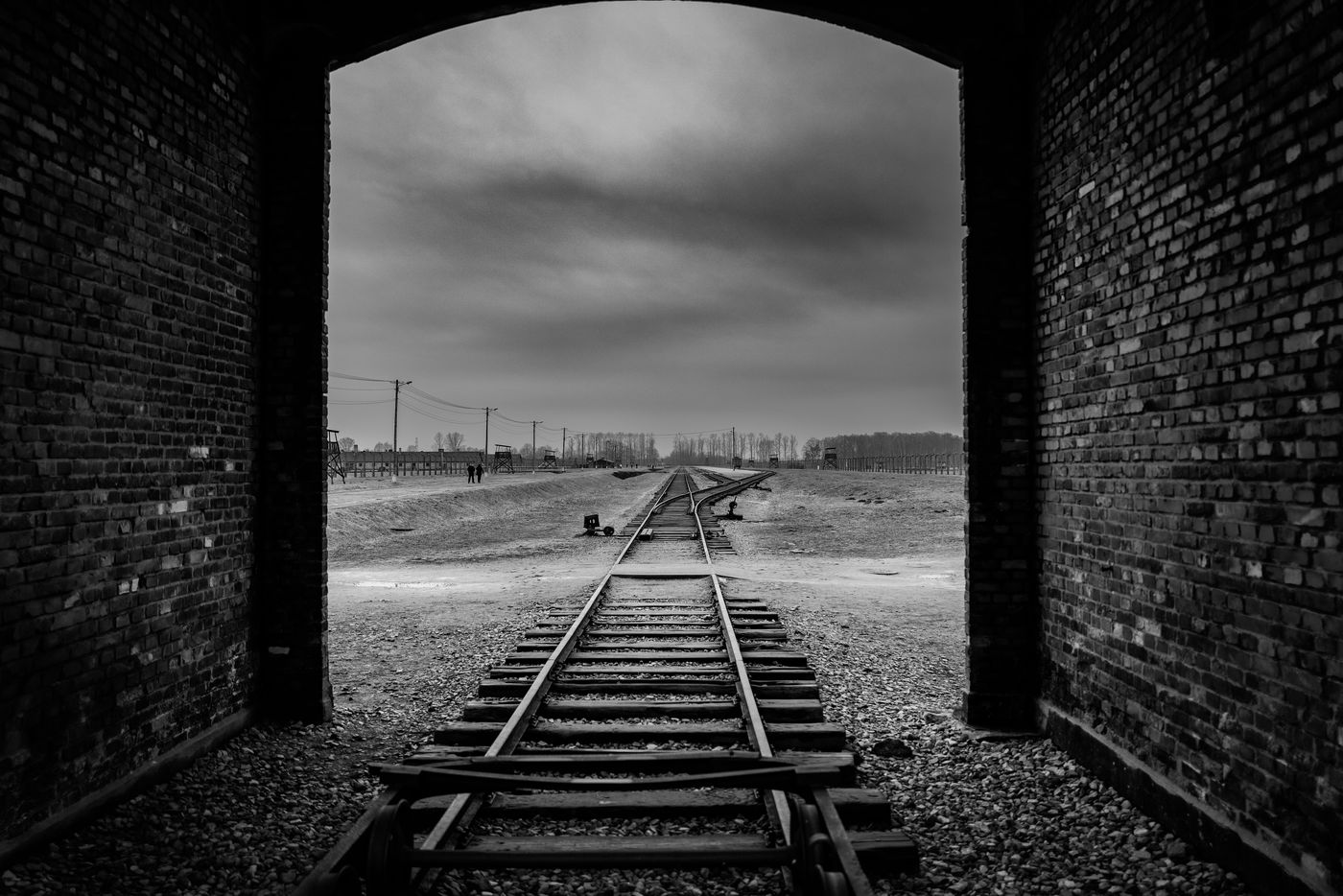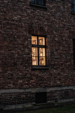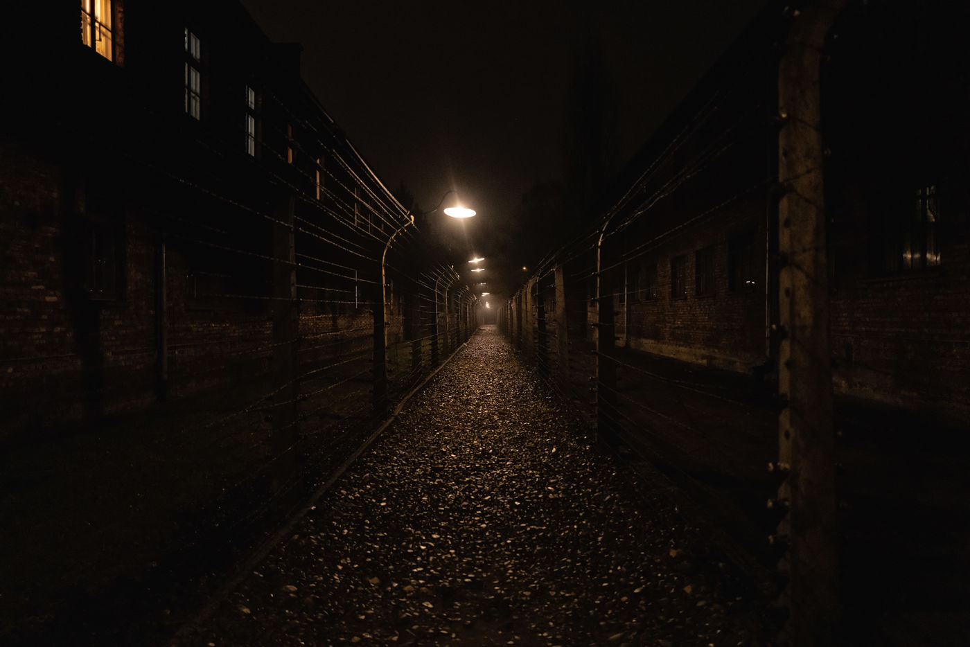 Le camp d'Auschwitz entre ombre et brouillard