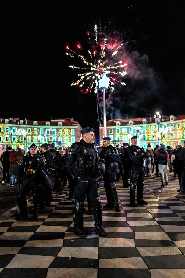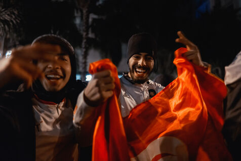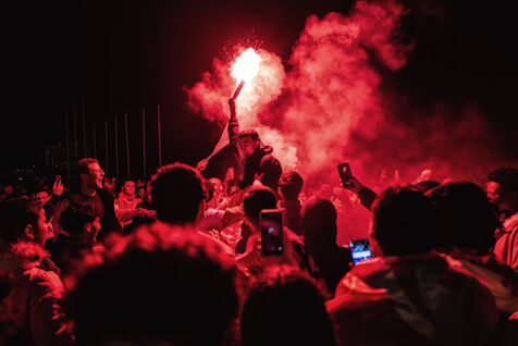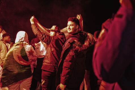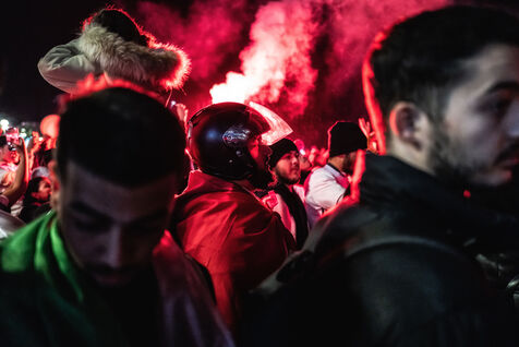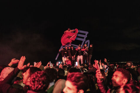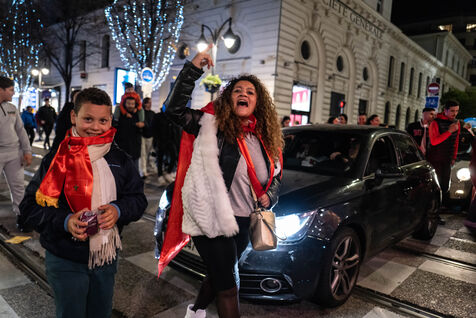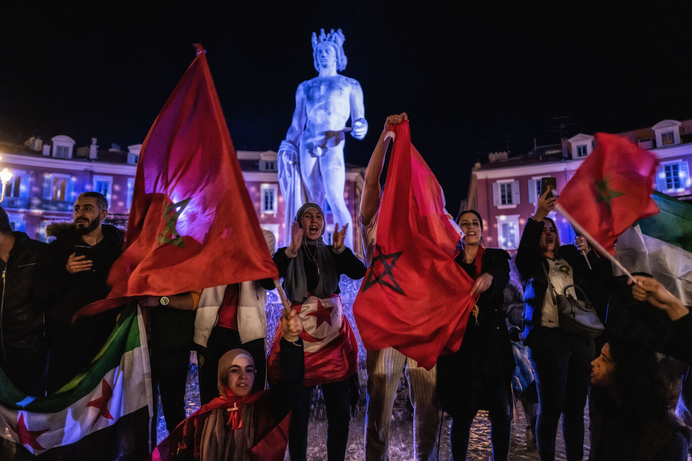 In Nice, France, on the promanade des anglais, Moroccan fans celebrate the victory of Morocco and the qualification for the semi-finals of the soccer world cup in Qatar