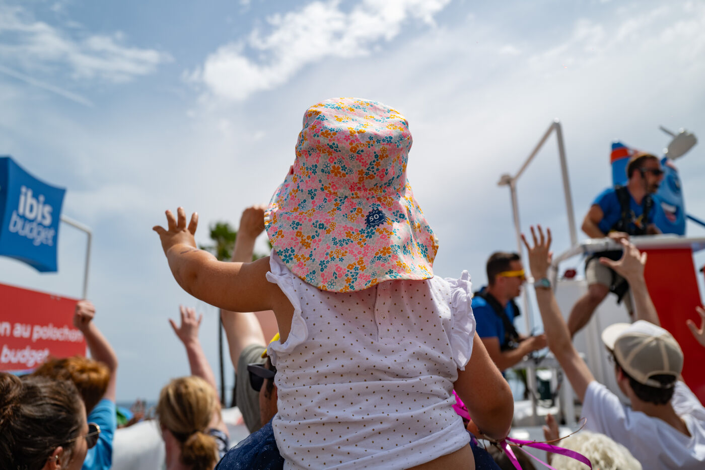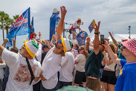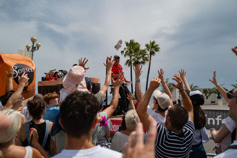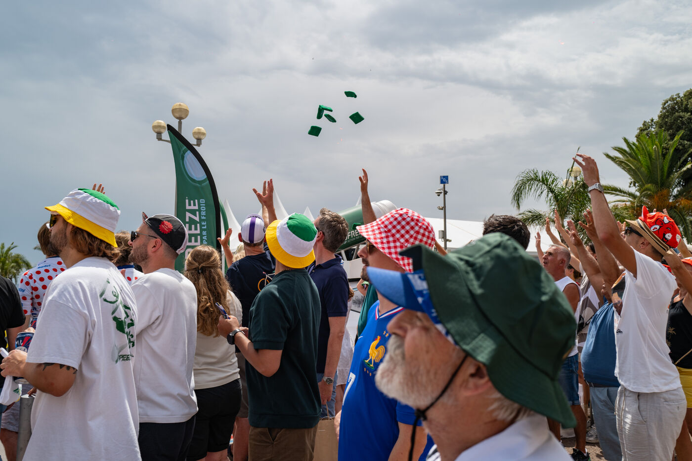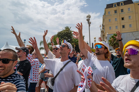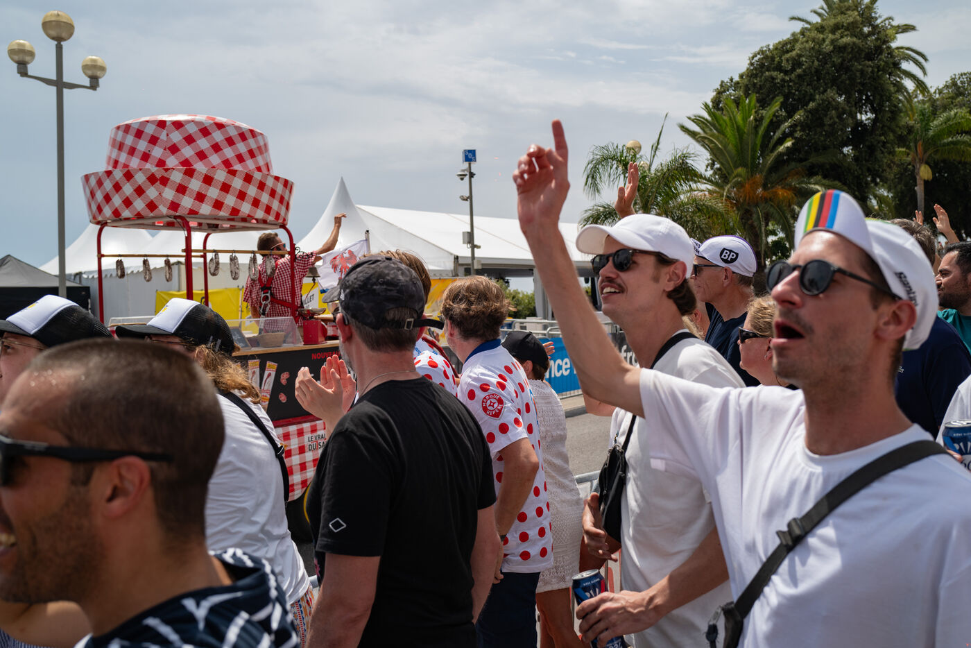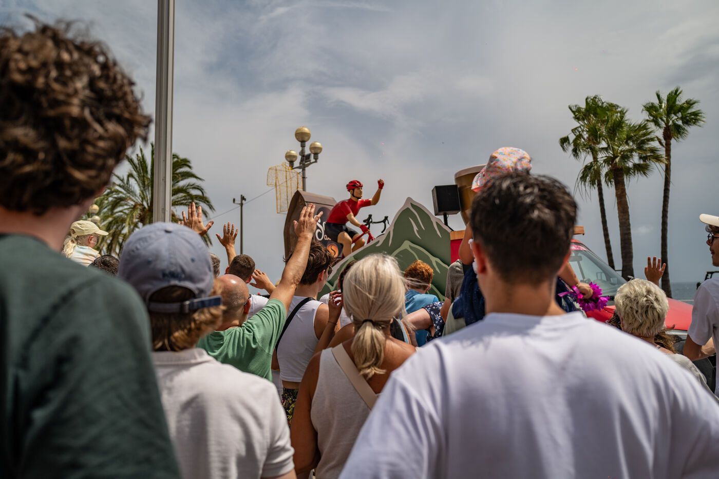 La caravane du tour de France de cyclisme arrice à Nice pour les deux dernière étapes. Toute la ville est en effervescence et des dizaines de milliers de participants attendent le passages des courreurs sur la promenade des anglais.
