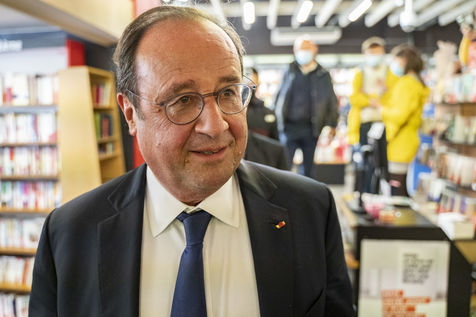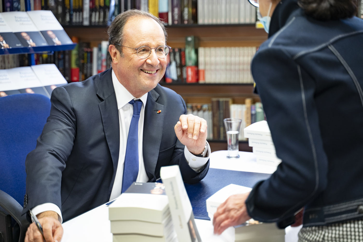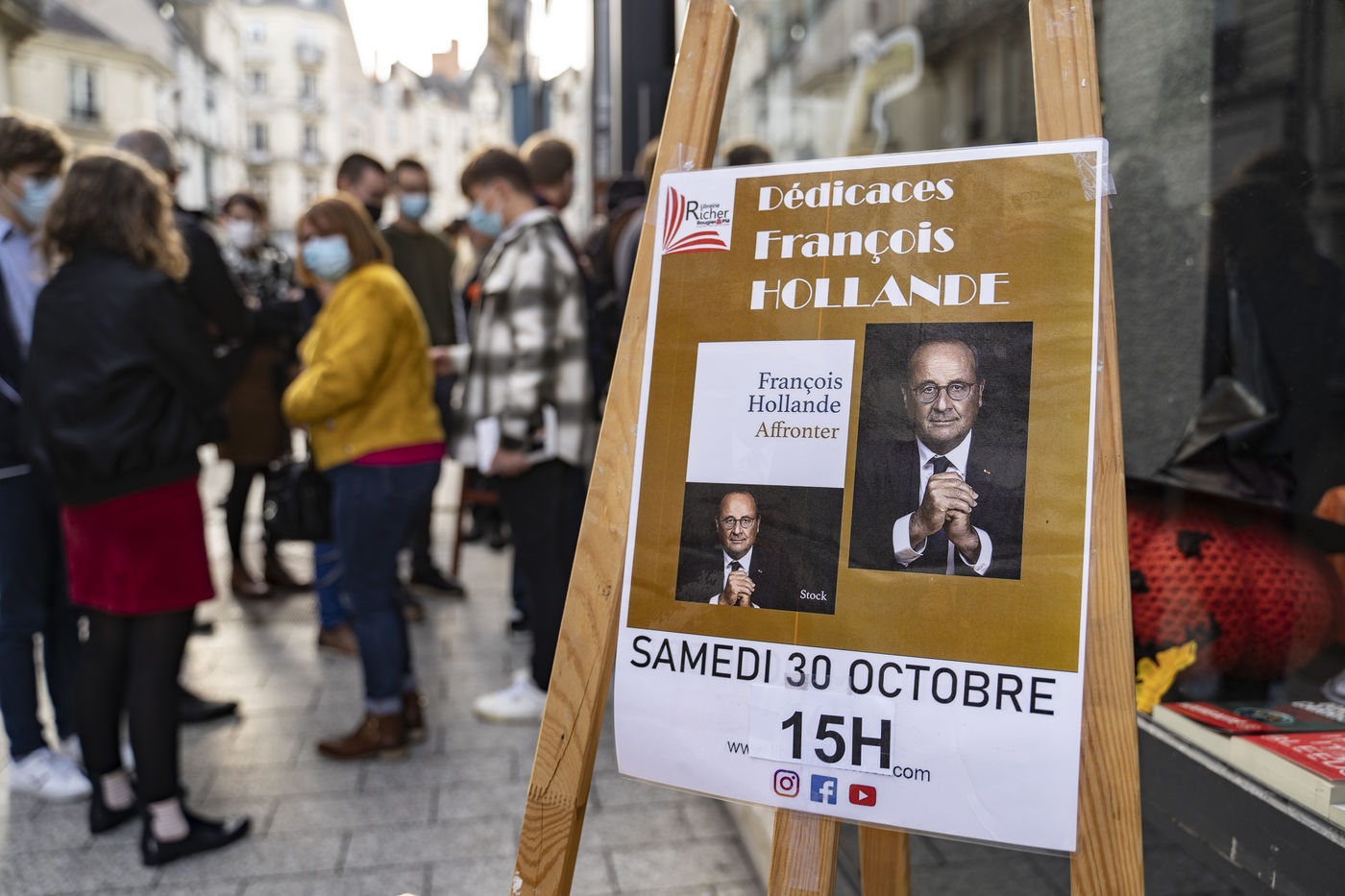 L'ancien président de la République française, François Hollande, dédicace son livre « Affronter » (éd. Stock) à la librairie Richer à Angers, le 30 octobre 2021.