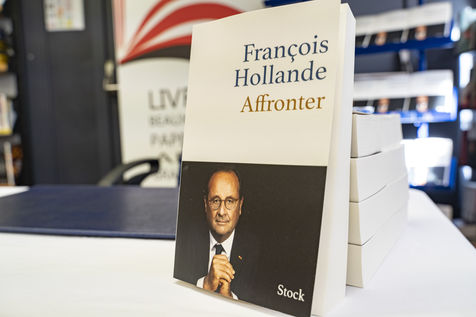 Former French President François Hollande signs his book "Affronter" (Stock) at the Richer bookstore in Angers.