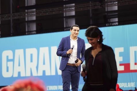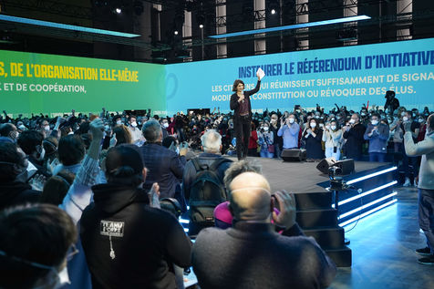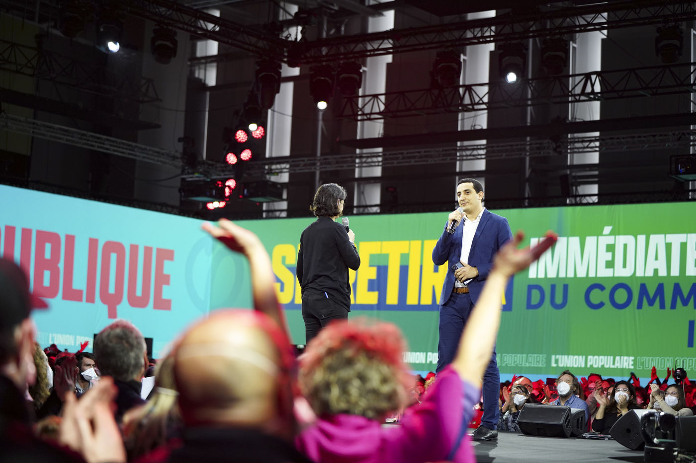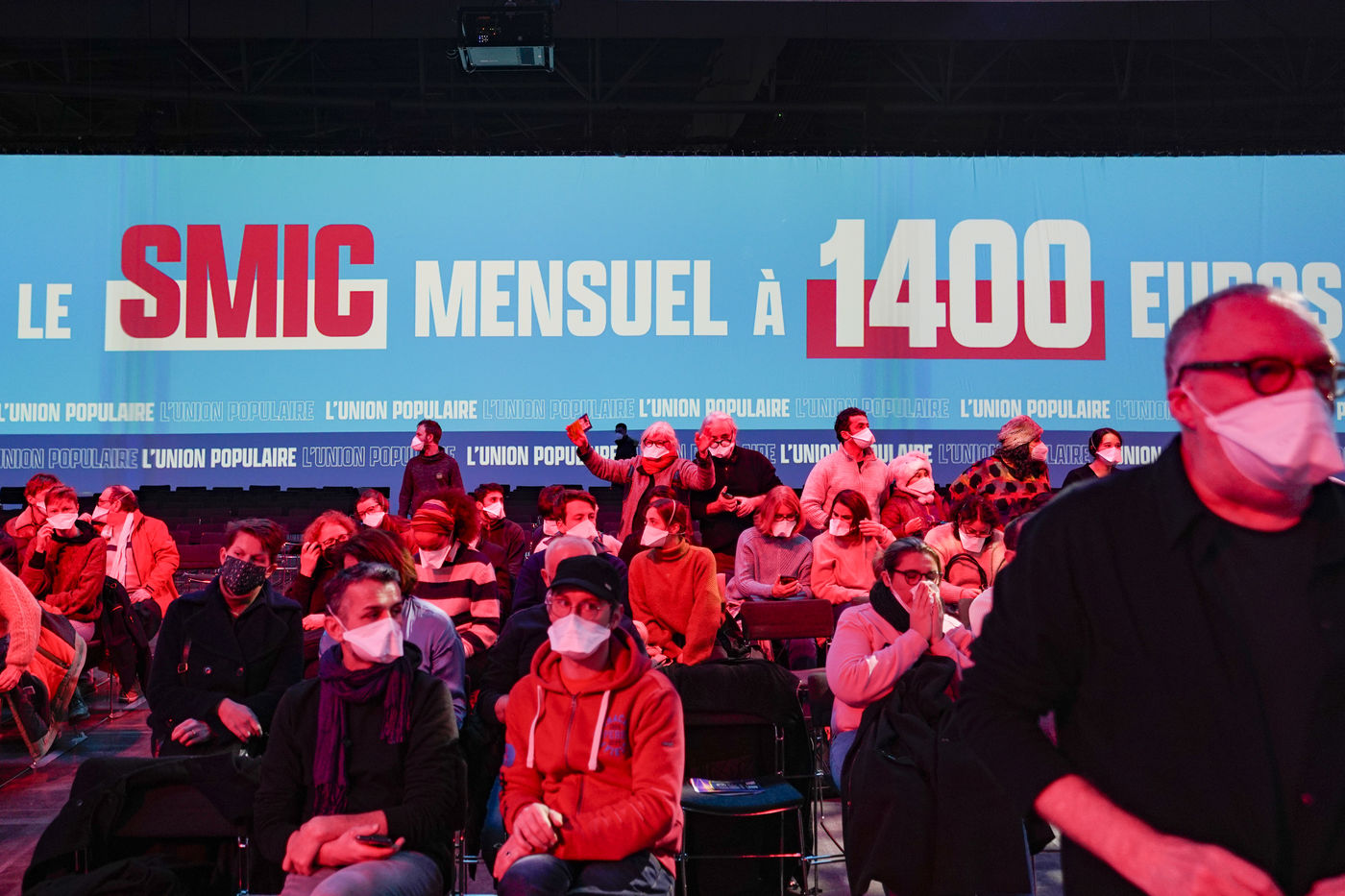 Dans le cadre de la campagne politique à l'élection présidentielle de 2022, Jean-Luc Mélenchon tient une réunion publique à Nantes, dimanche 16 janvier 2022. Ce meeting immersif et olfactif se veut une première mondiale.