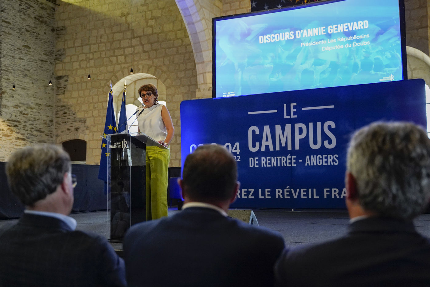 Dimanche 4 septembre 2022, journée de clôture du campus de rentrée des jeunes « Les Républicains », au Grenier Saint-Jean, à Angers. De nombreux cadres du parti participent à ce campus, entourés de 1700 jeunes militants.