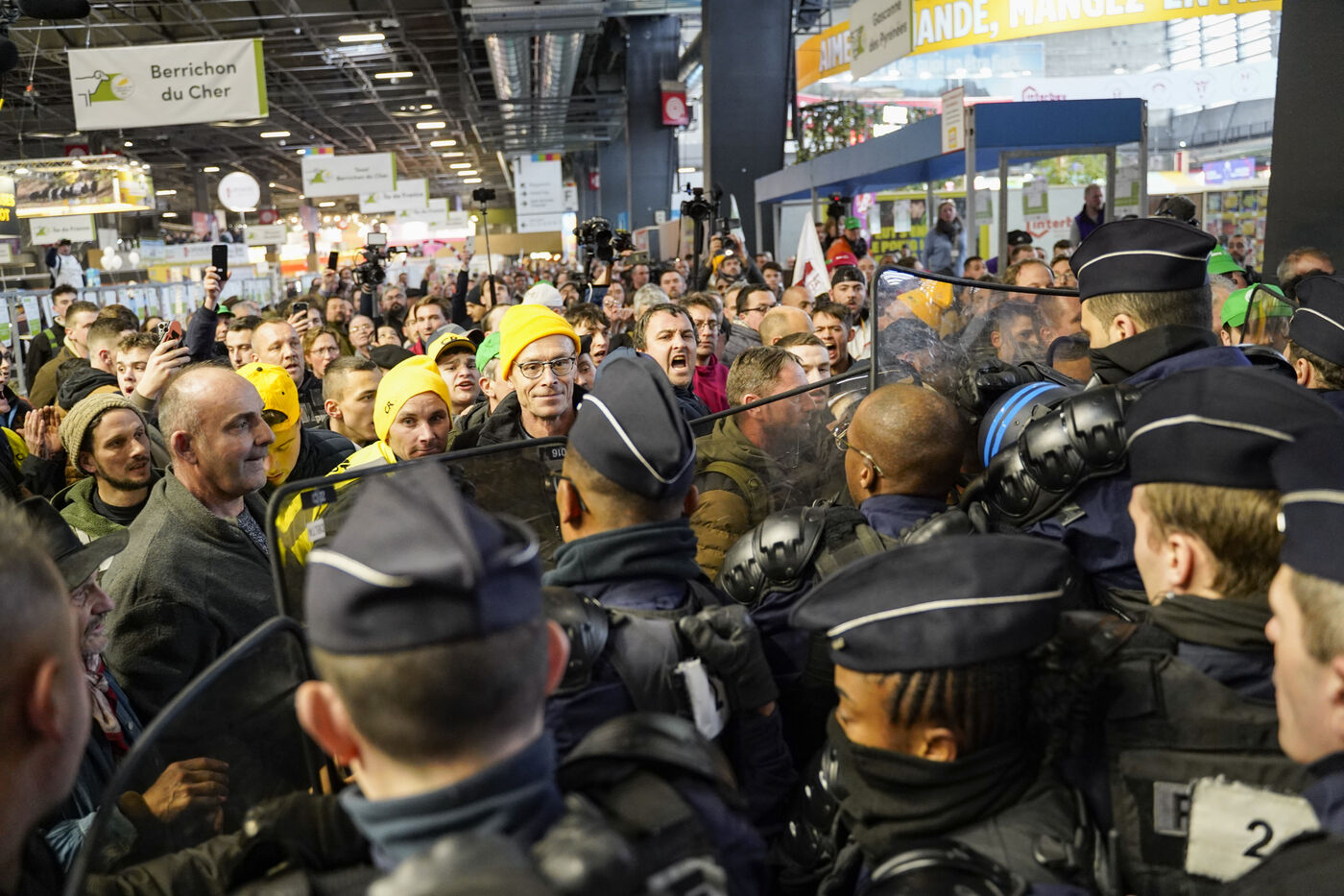 Colère paysanne au salon de l'agriculture contre de la visite du Président de la République, le samedi 24 février 2024, lors de la 60ème édition, porte de Versailles.