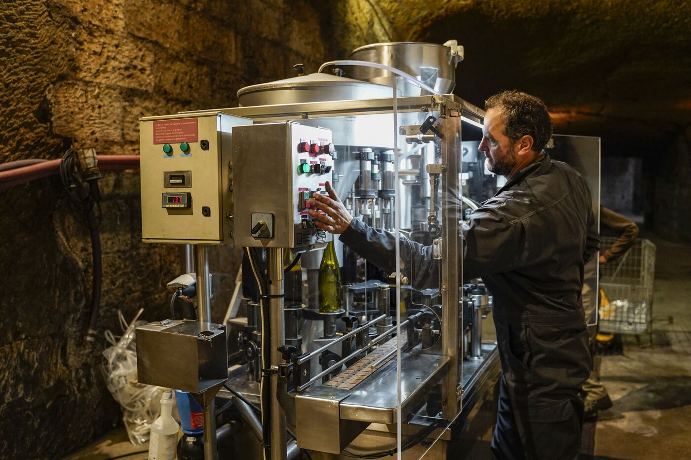 Prestataire auprès de plusieurs vignerons indépendants du Val de Loire, Davy est embouteilleur depuis plus d’une vingtaine d’années. Ce matin, c’est 60 hectolitres de vin de Saumur-Champigny, du millésime 2023, qu’il met en bouteille à la propriété d'un viticulteur du Saumurois. Pour cela, il a placé son monobloc de tirage près des cuves à vin entreposées dans le chai situé à l'intérieur d'une cave de tuffeau. Pour ce travail, il est aidé de deux ouvriers agricoles de la propriété.