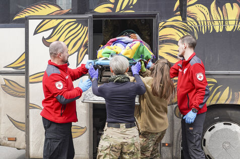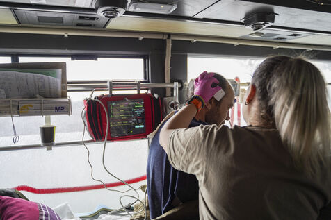 During the return journey, each member of the team devotes himself to care: stabilisation of vital parameters, administration of medication, continuous monitoring. The atmosphere remains concentrated and calm. Once they arrive in Dnipro, the injured are handed over to the local hospital staff, who provide long-term care.