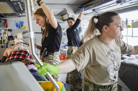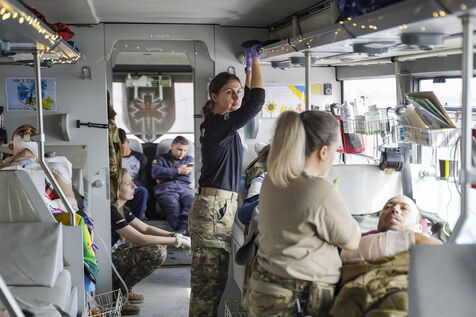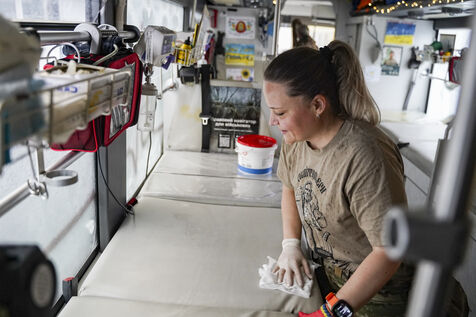 Today's team is made up of four female volunteers: Tatyana, Yulia, Olha and Marichka. Aged between 23 and 40, they come from diverse backgrounds - cinema, IT, finance, renewable energy - but share the same commitment: to caring for and saving lives in the midst of a war that has been going on for more than three years. Their motto, common to all members of Les Hospitaliers: ‘For the good of every life’. Their means of intervention is a medical bus, named Avstriyka (the Austrian), in memory of a colleague who died on a mission, whose portrait and code name now adorn the vehicle. This bus is equipped to take care of several critically injured people, with all the medical equipment needed for a live evacuation.