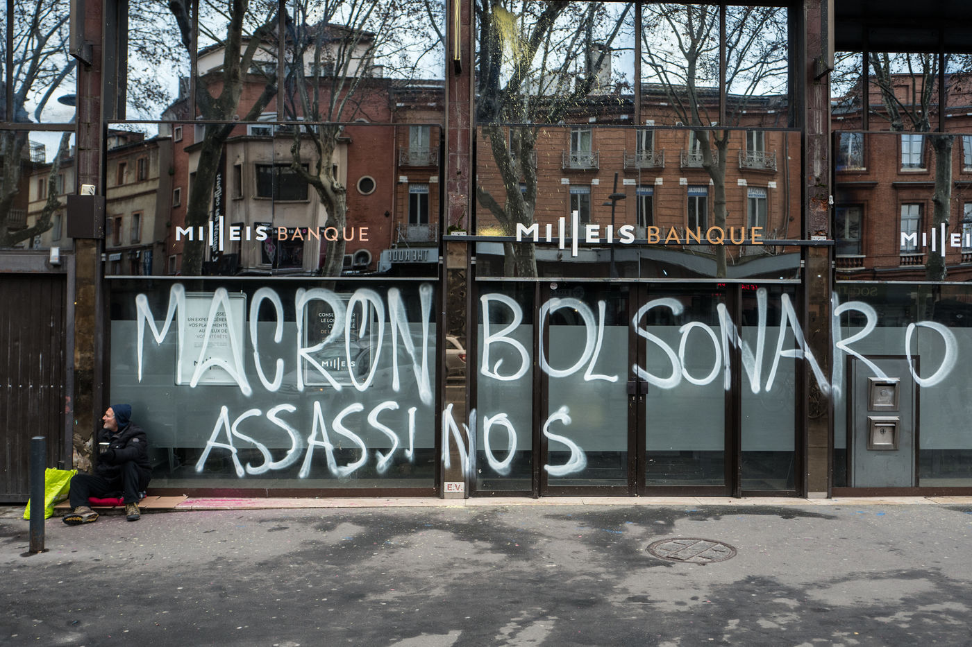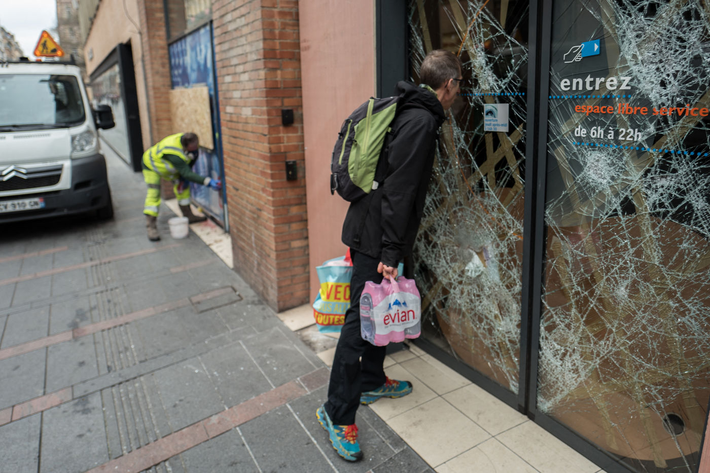 Vitrines saccagées, distributeurs de billets éclatés, horodateurs peints, la facade du Capitole souillée d'huile de vidange, tags dans le centre ville après l'acte X de la mobilisation du mouvement des Gilets Jaunes. Au départ ils protestents contre la hausse du carburant et maintenant pour le pouvoir d'achat, la mise en place du RIC.