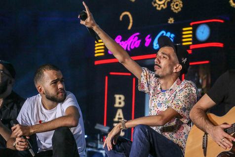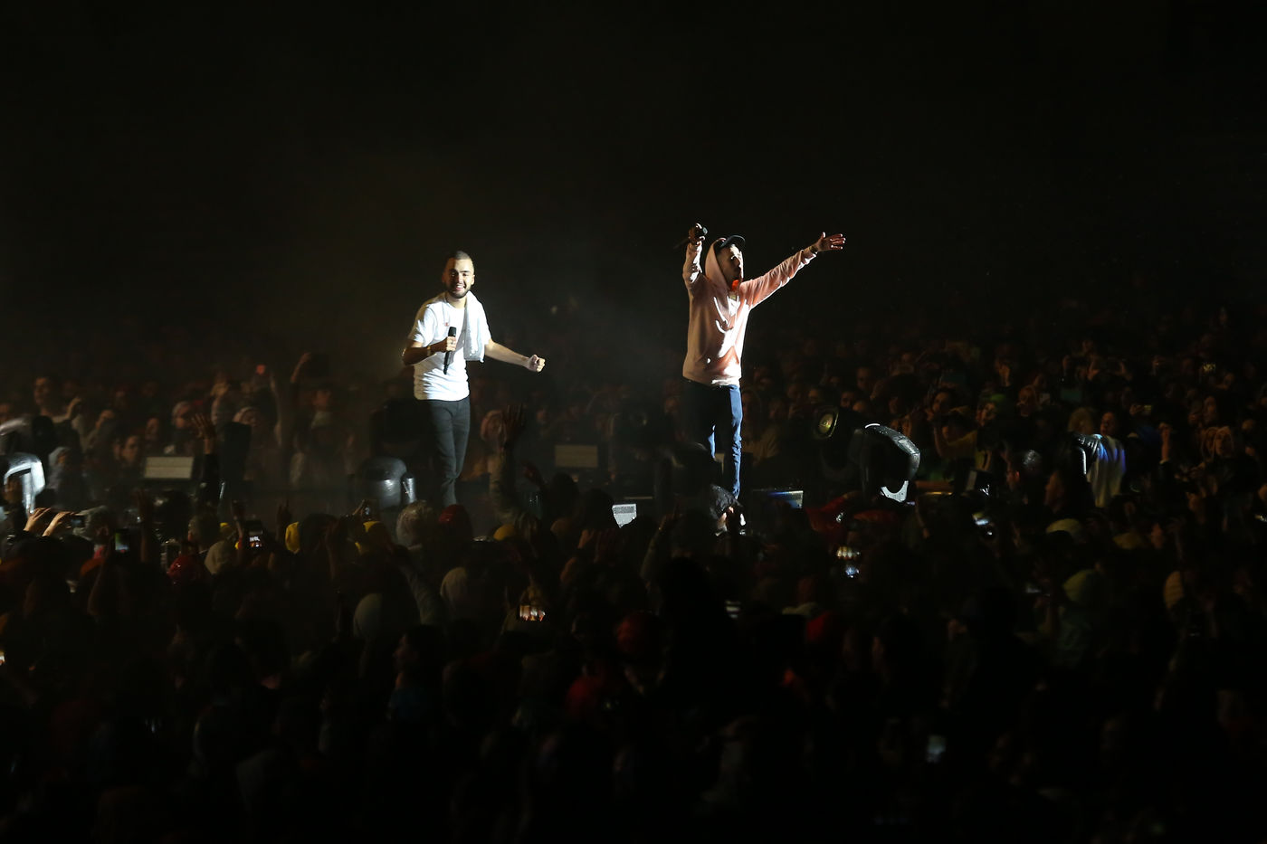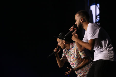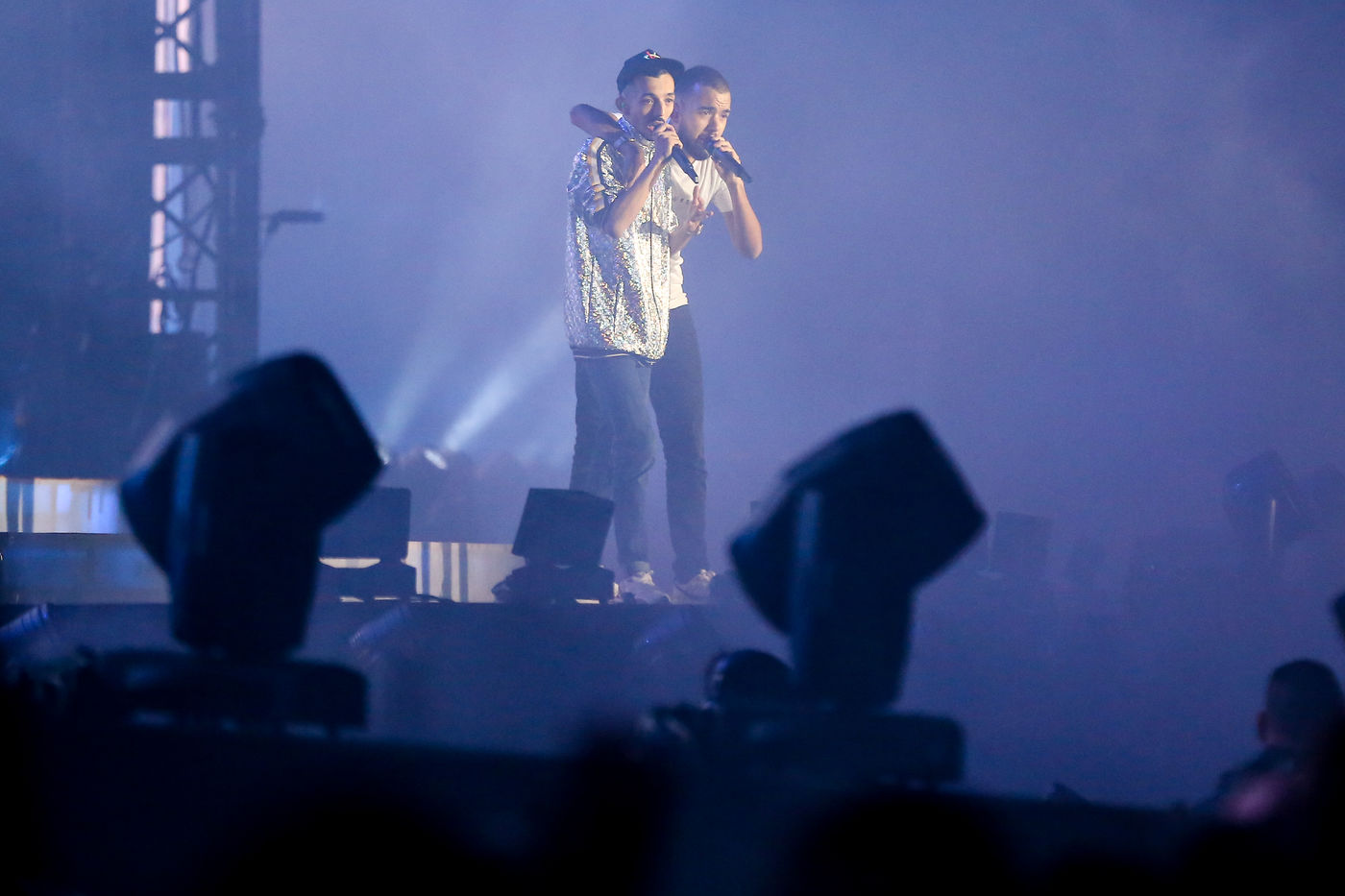 The two rappers Bigflo & Oli during their show at the Stadium de Toulouse which they decided to fill on May 24 and 25. Bigflo et Oli, sometimes abbreviated B&O, is a French rap group from Toulouse. It is composed of Florian Bigflo and Olivio Oli Ordonez. The duo released their first album La Cour des grands in 2015, they are certified gold record less than four months after its release and platinum record in France. They are to this day the youngest French rappers to hold these awards. May 24, 2019, Toulouse, France.