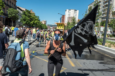 A thousand people marched through the city centre of Toulouse in the south of France during the XXIX act of the Yellow Vests movement. The movement began in France on 17 November 2018 to protest initially against the rise in fuel prices, for purchasing power, the creation of the RIC and the movement turned into a major revolt against French President Emmanuel Macron. About 1000 people demonstrated calmly before the police used tear gas to disperse the demonstration. June 1, 2019, Toulouse, France.