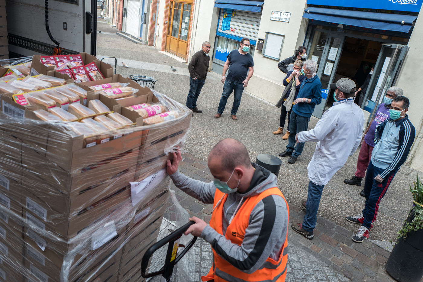 Au local de l'Ostalada des bénévoles du Secours Catholique recoivent les dons de la banque alimentaire et préparent des repas qui seront distribués aux personnes les plus démunis, notamment les Sans Domicile Fixe alors que la France est passée en confinement le 17 mars pour contenir l'épidemie liée au Coronavirus.