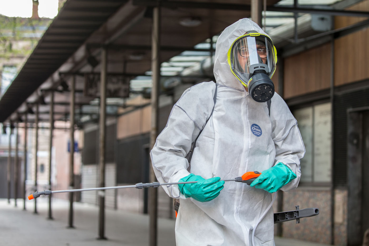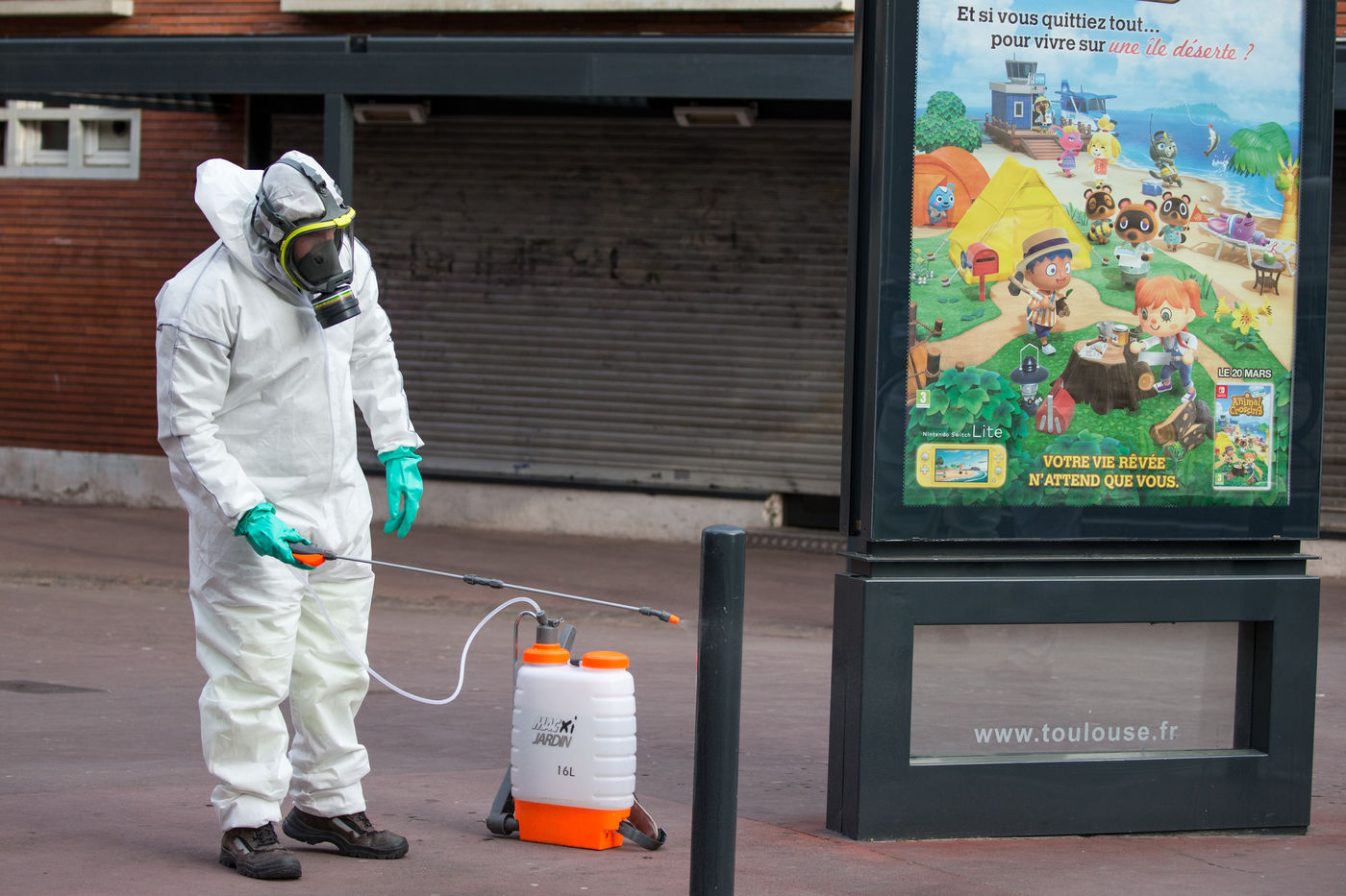 Depuis le 6 avril la ville de Toulouse a mis en place la désinfection du mobilier urbain a proximité de 180 sites ciblés sur tout le territoire de la commune. Les agents municipaux sont masqués et sont revêtus de combinaisons intégrales, ils pulvérisent un mélange d'eau et de javel pour nettoyer et limiter la propagation du Coronavirus, Covid-19, alors que la France est en confinement depuis le 17 mars 2020.
