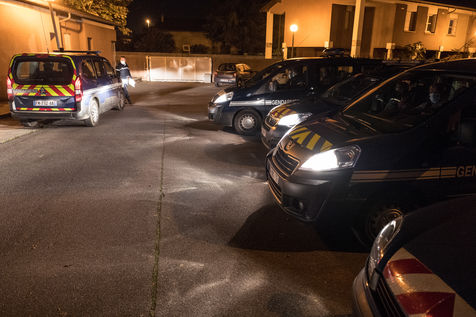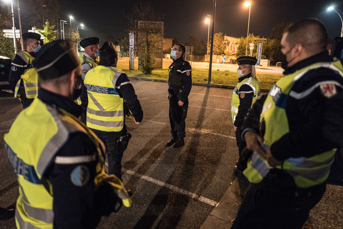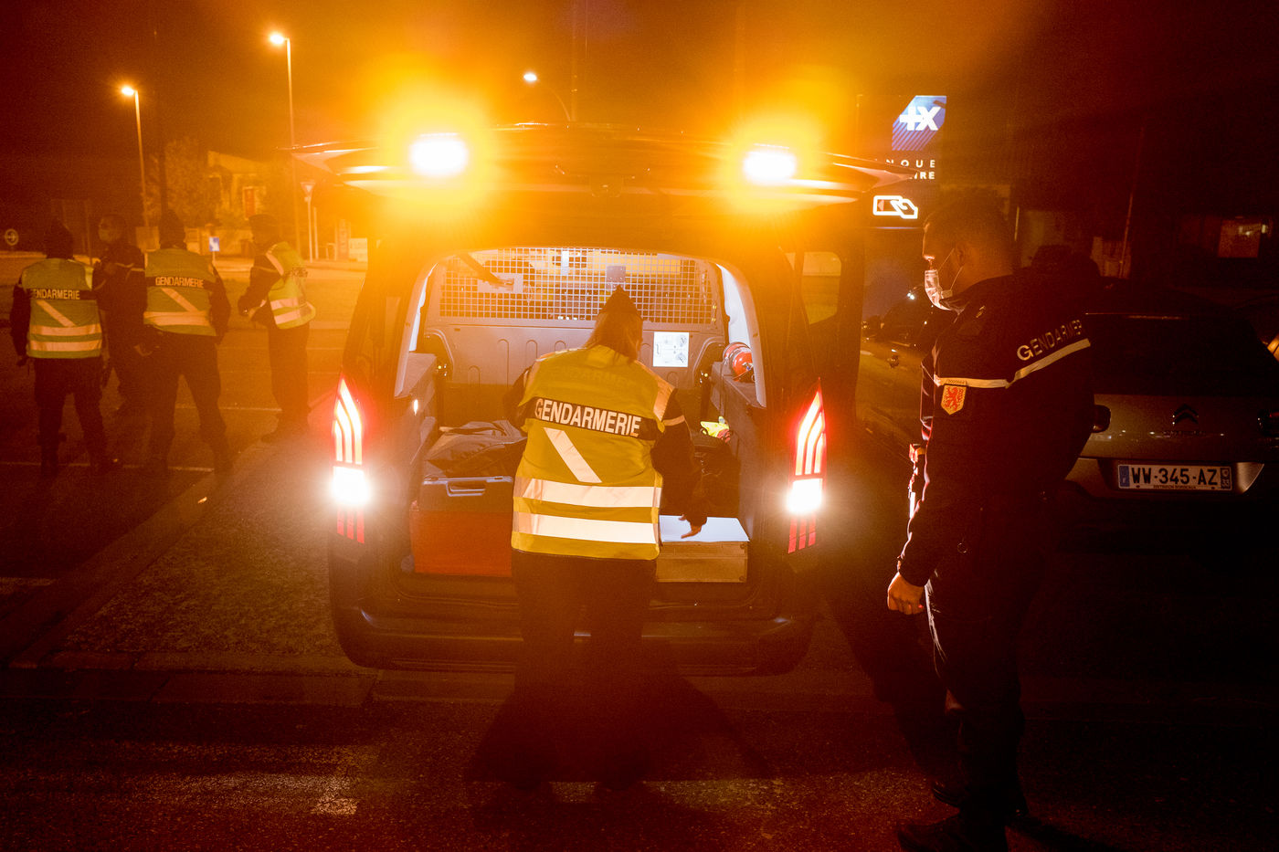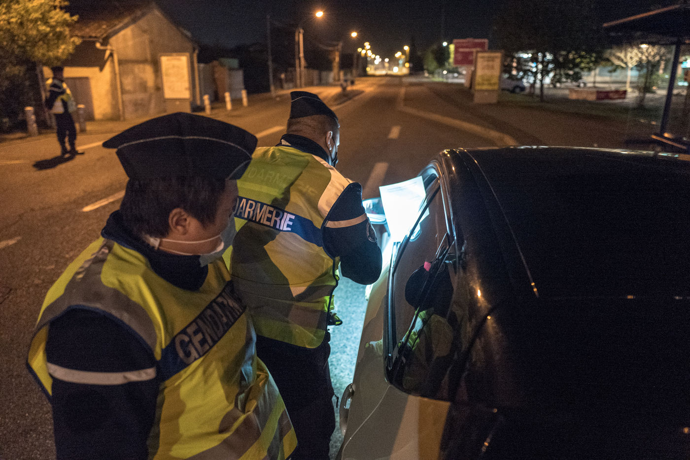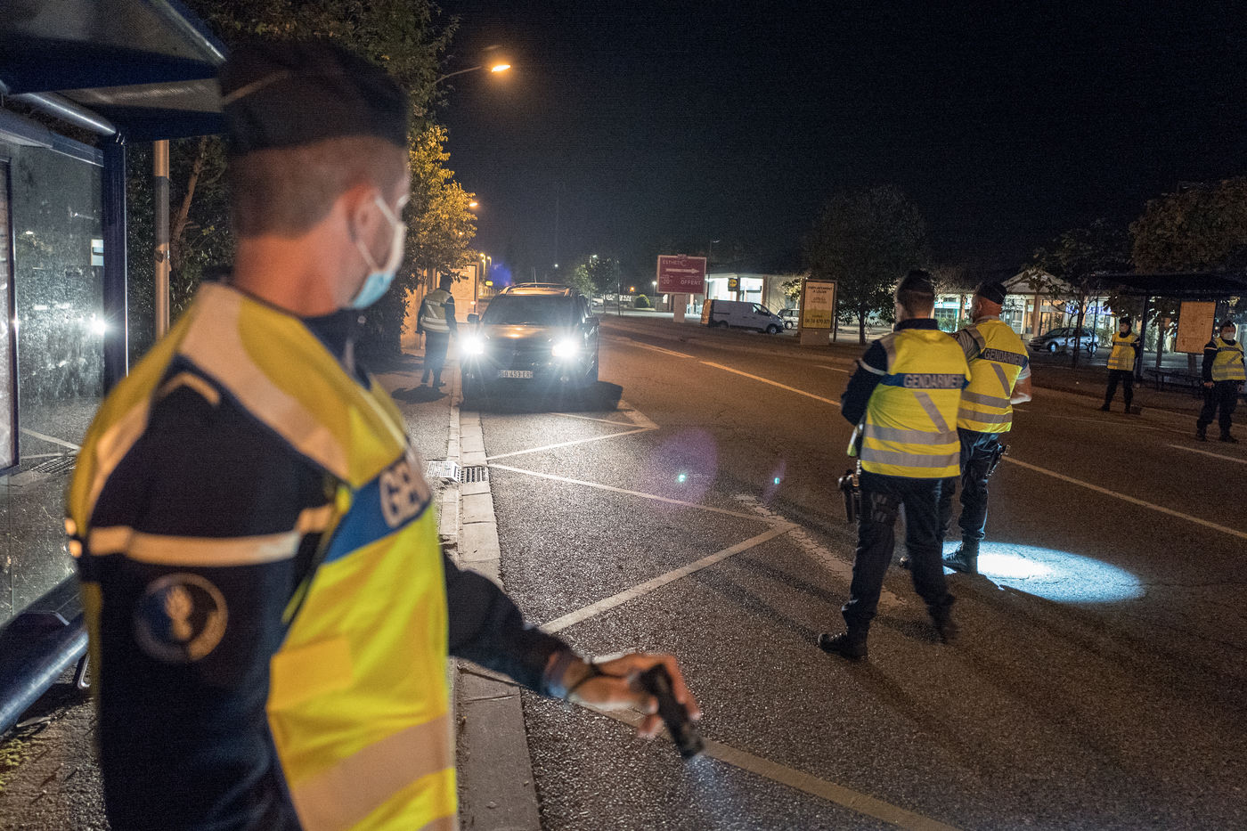 Des gendarmes de la compagnie de Toulouse Mirail effectuent des controles d'attestations dérogatoires de sortie pour la seconde soiree de couvre feu qui commence à 21h.