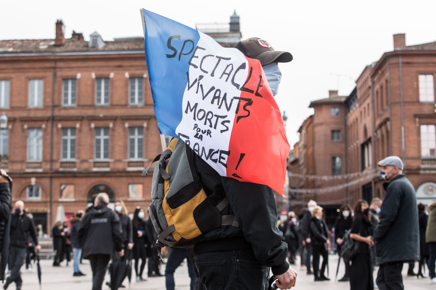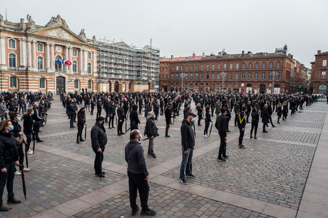 A l'appel de syndicats patronaux, un millier de commercants et petits entrepreneurs des commerces non essentiels ont realisé un die-in sur la place du Capitole.