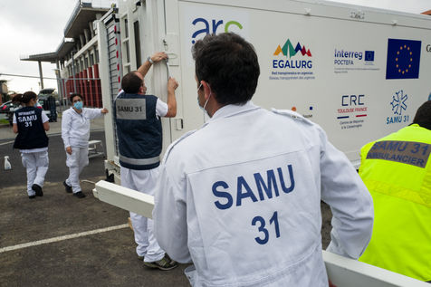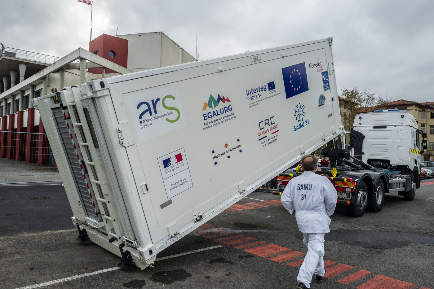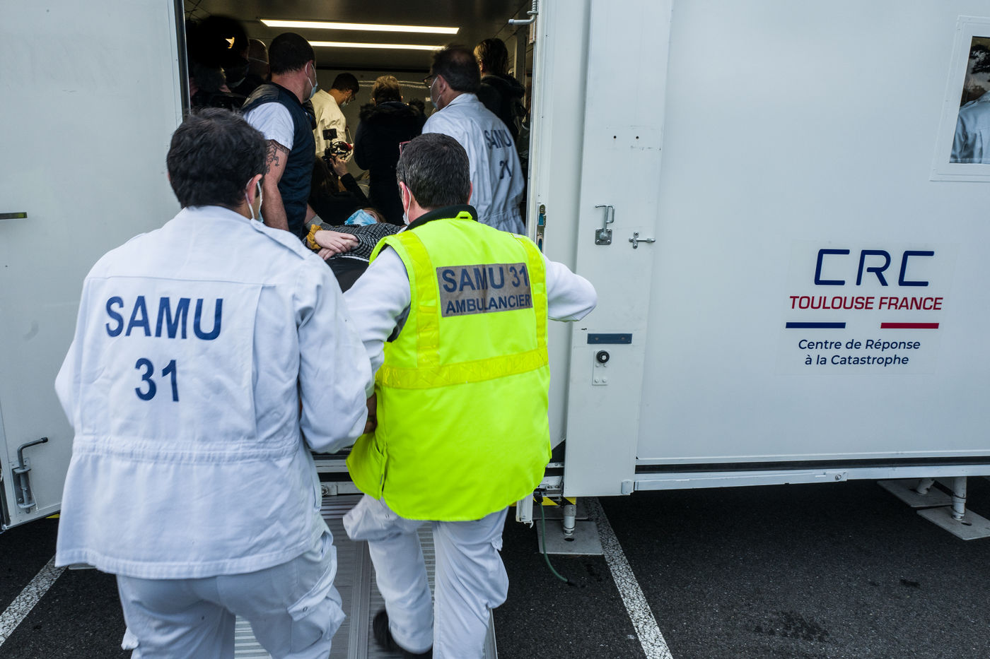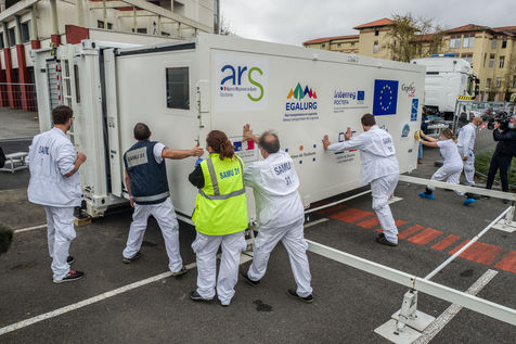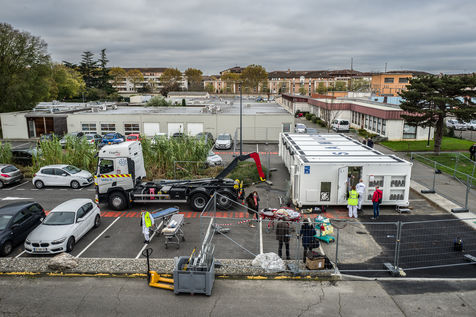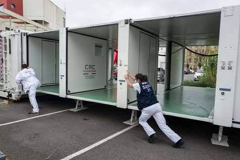 Dans le cadre de la lutte contre l'épidémie du Coronavirus, Covid-19, le CHU de Toulouse teste un camion prototype issu de la technologie militaire unique en Europe, Centre de Réponse à la Catastrophe, CRC, qui pourra en moins dune heure mettre à disposition 5 salles pour accueillir jusqu'à 18 patients en réanimation. Après plusieurs tests, le camion part pour Bayonne.