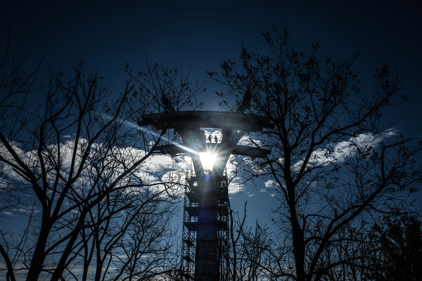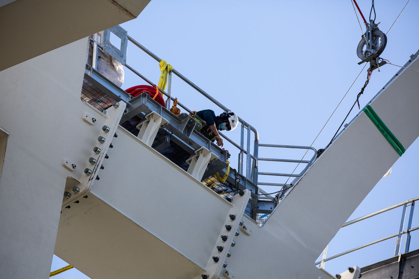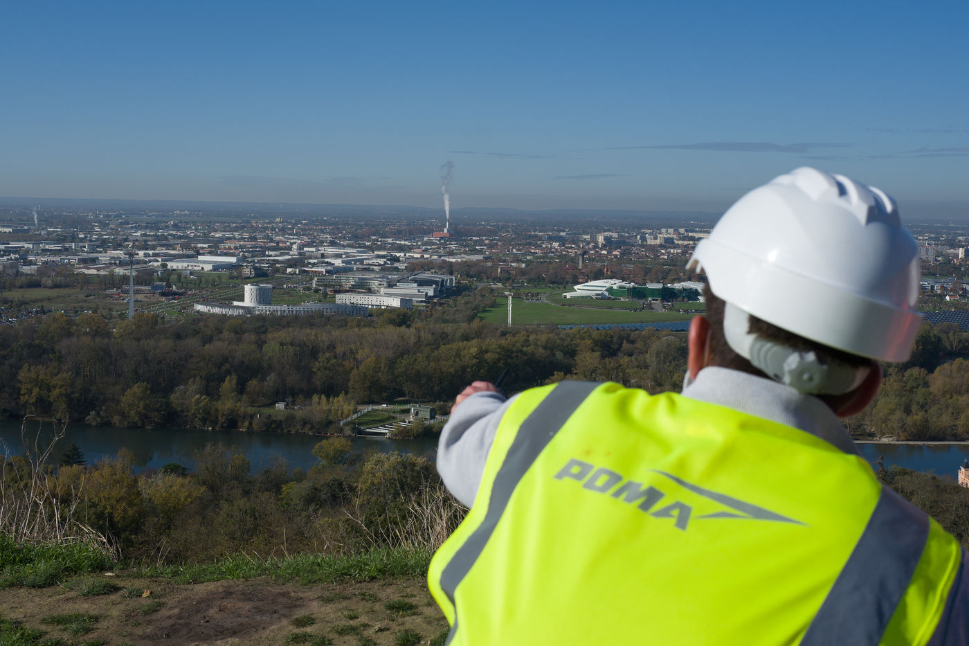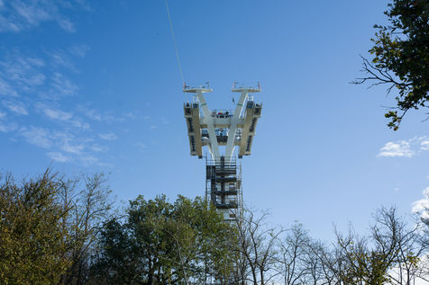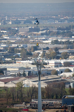 Un helicoptère militaire Puma pose et déroule trois cables sur trois kilometres entre les cinq grands pylones du futur telepherique Téléo dont l'ouverture est prévue pour 2021. Il reliera l'Oncopole à l'université Paul Sabatier dans la partie sud de l"agglomération toulousaine.