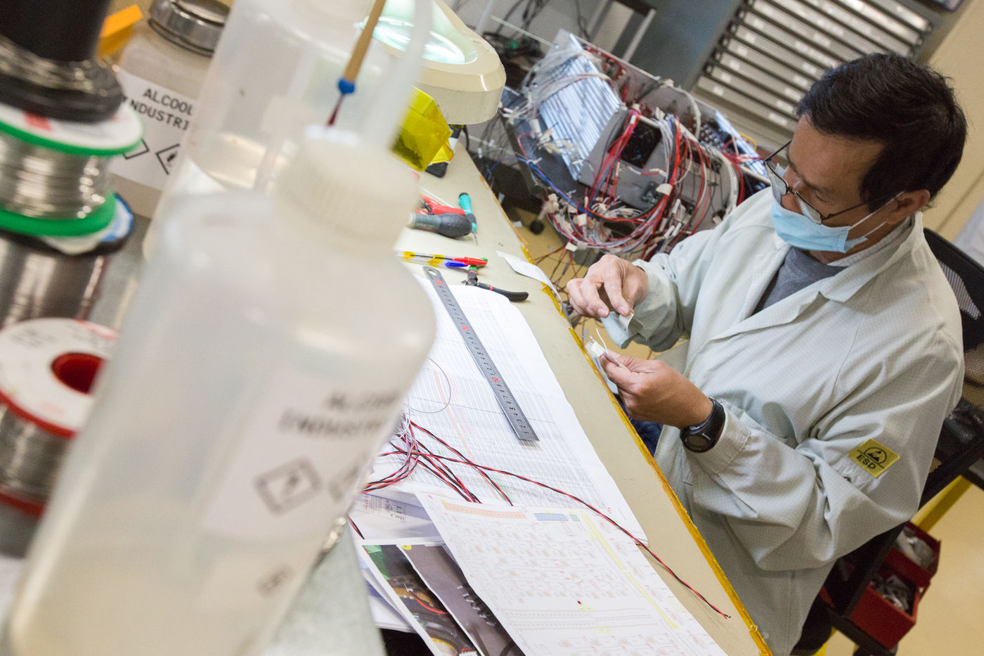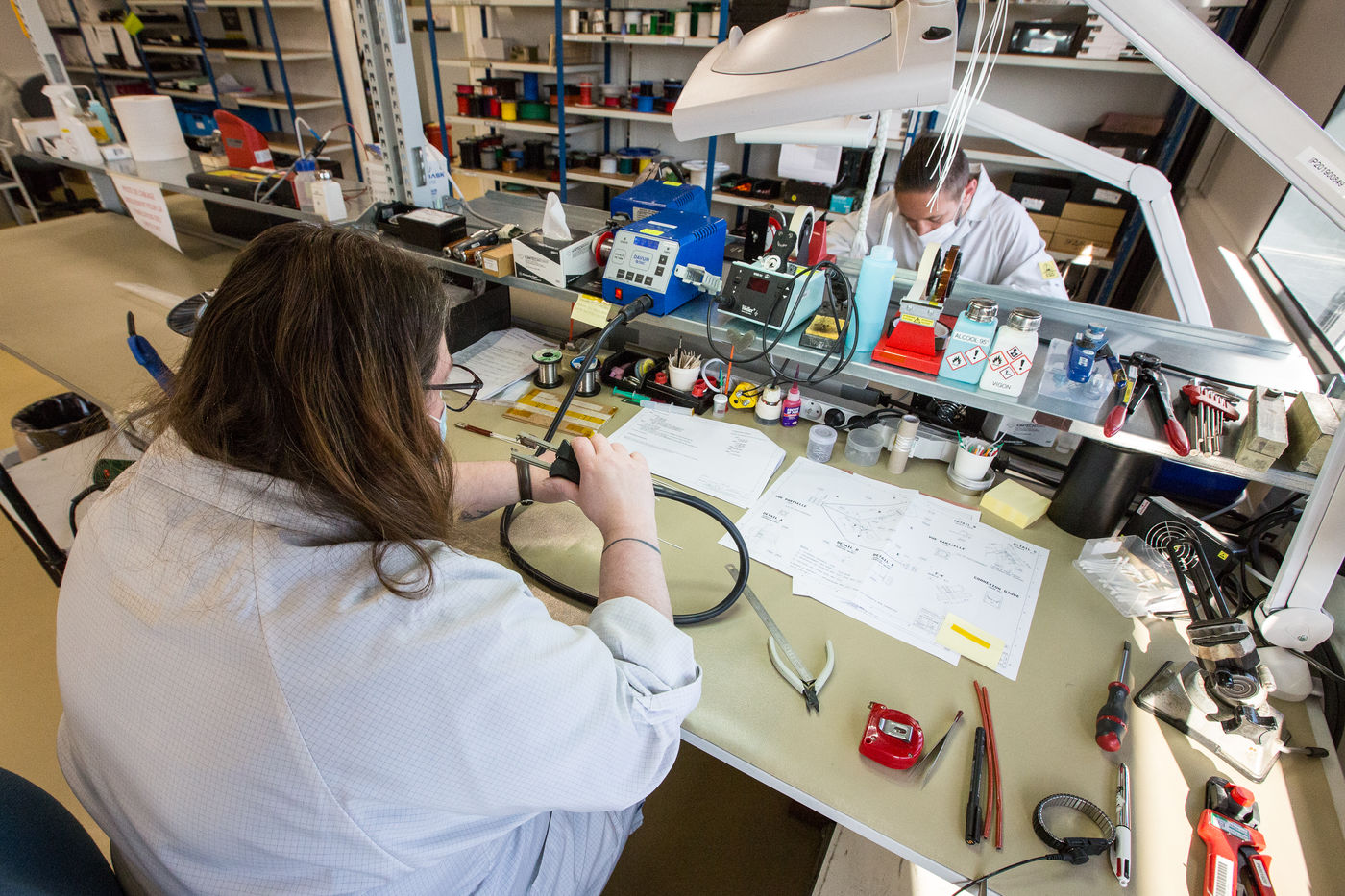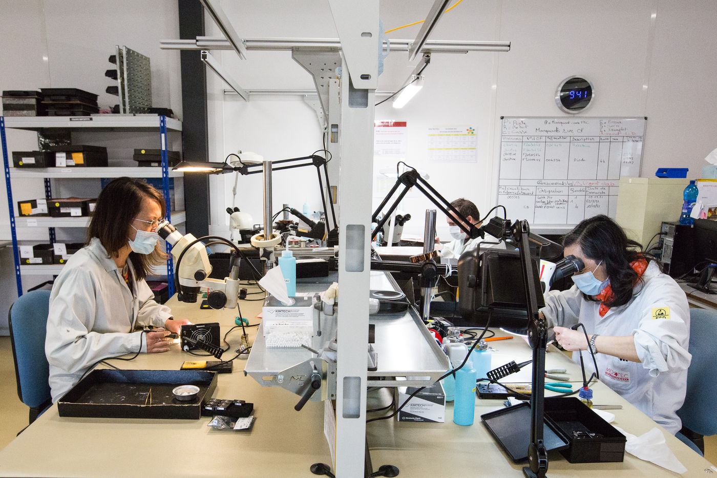 Employees work in the premises of the Microtec company, which focuses its activities mainly on the space, aeronautics, defense, automotive and medical sectors. This company specializes in the design, industrialization and manufacture of cards, electronic and mechatronic equipment, test engineering, prototyping, industrial wiring.