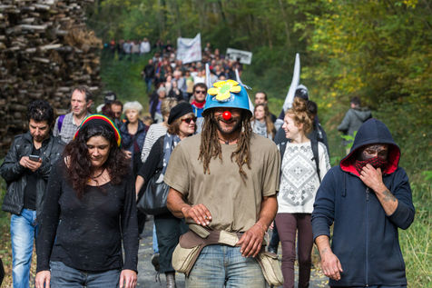 Commémoration de l'anniverssaire de la mort de Rémi Fraisse décédé d'un tir de grenade offensive dans la nuit du 25 octobre 2014 sur le chantier du projet de barrage dans la forêt de Sivens dans le Tarn. Environ trois cent personnes se sont réuni devant une sculpture sur la dalle ou est décédé le jeune militant écologiste.