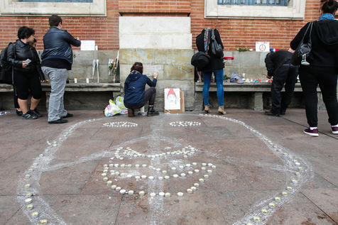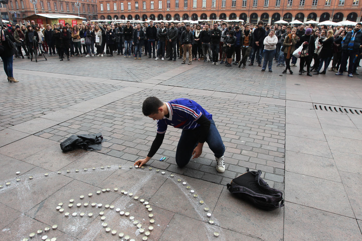 Rassemblement improvisé Place du Capitole à la mémoire des victimes des attentats de Paris le 13 novembre. Des djihadistes de l'état islamique ont revendiqué une série d'attaques coordonnées par des hommes armés et des kamikazes qui ont fait au moins 129 morts et 352 blessés dans la capitale Française dans plusieurs sites de la ville. 14/11/2015, TOULOUSE, FRANCE