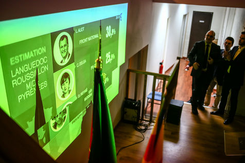 In the office off the National Front in Toulouse, Louis Aliot candidate for the region Languedoc-Roussillon Midi- Pyrénées comes top in the first round of regional elections with 33.4 % of votes.