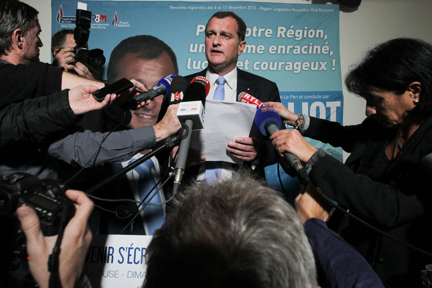 A la permanence du Front National à Toulouse, Louis Aliot candidat pour la région Languedoc-Roussillon Midi-Pyrénées- arrive en tête au premier tour des élections régionales avec 33,4% des voix.