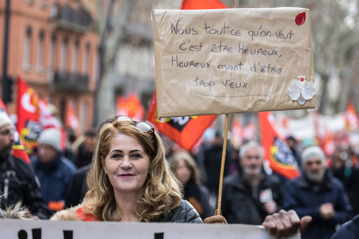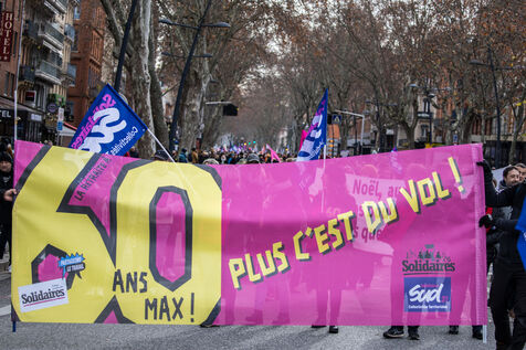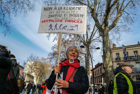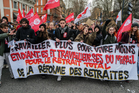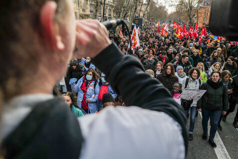 A l appel de tous les syndicats, entre 36.000 et 50.000 personnes ont defile dans le centre ville de Toulouse dans le sud de la France pour protester contre la reforme des retraites prevue par le gouvernement de la premiere ministre Elisabeth Borne.