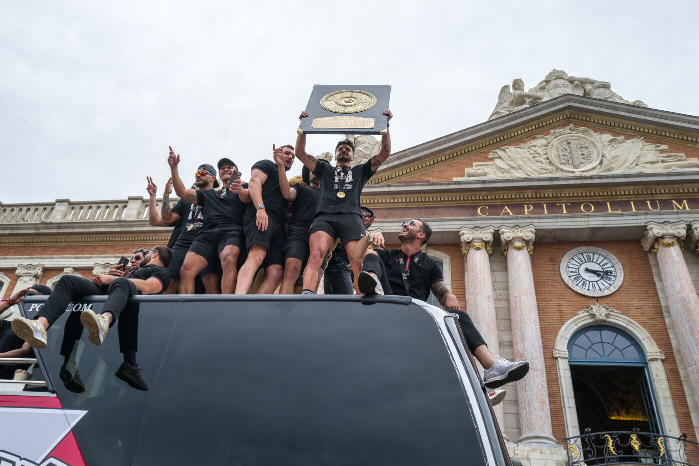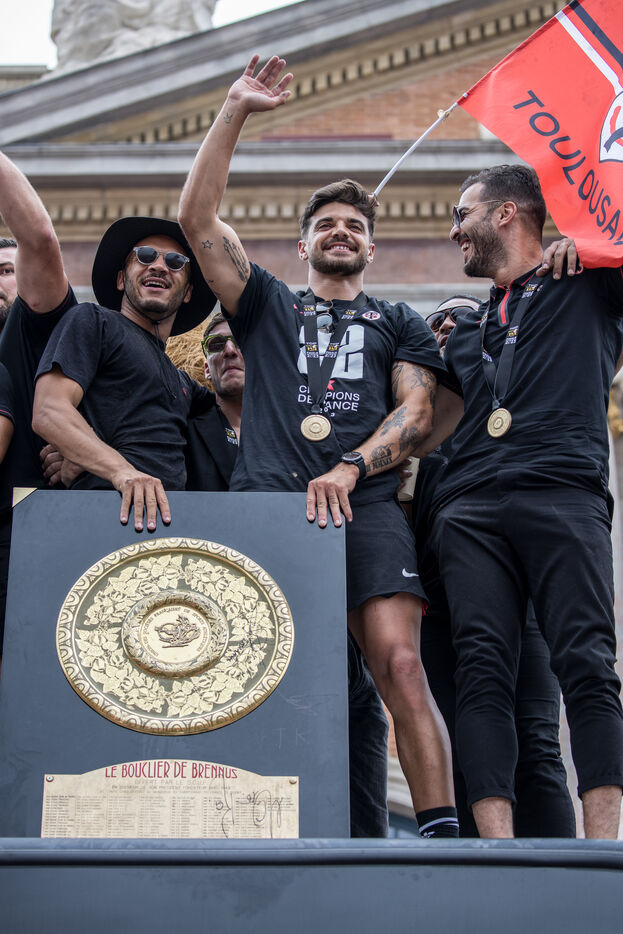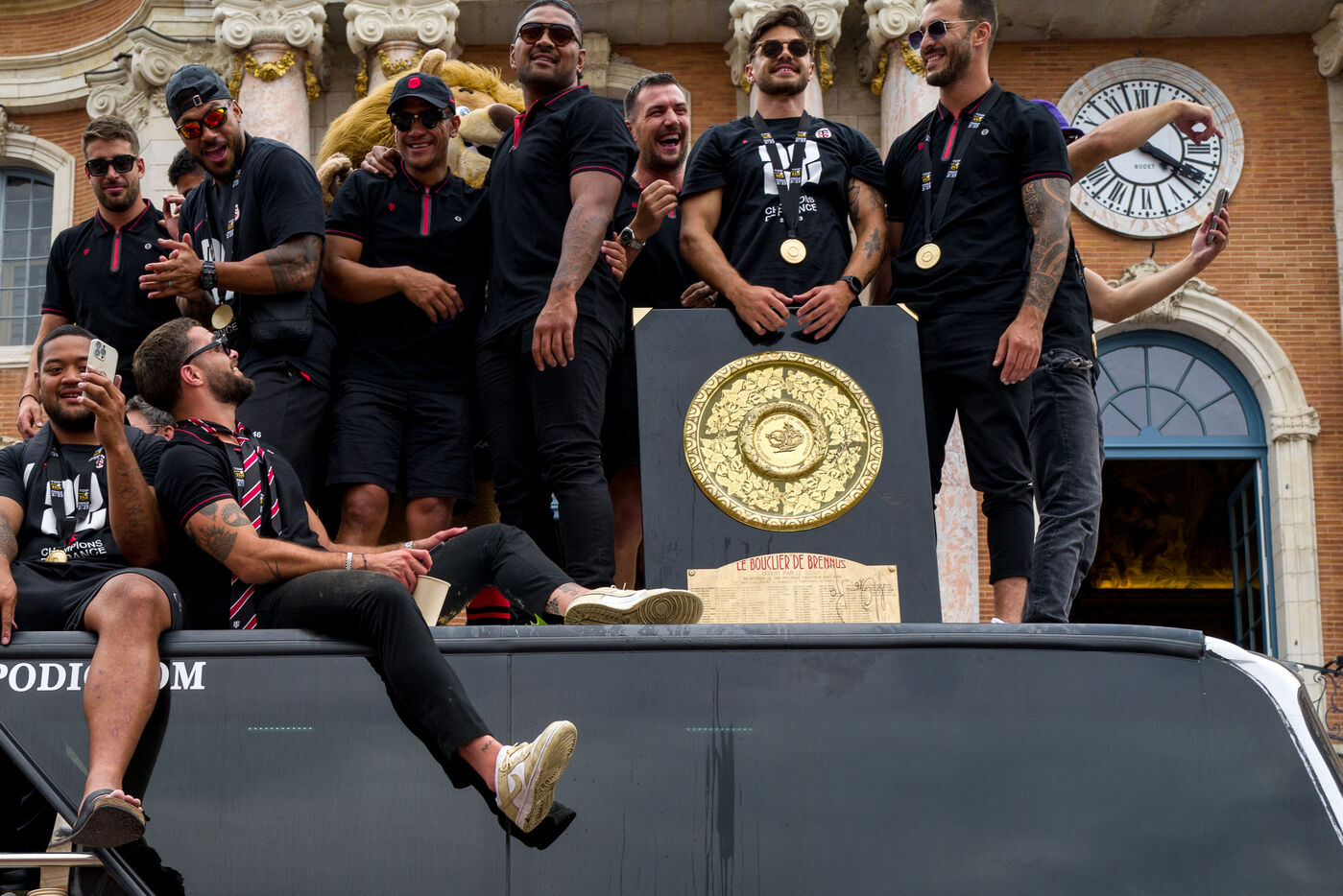 Romain Ntamack avec les joueurs du Stade Toulousain celebrent leur victoire en finale de Top14 contre la Rochelle avec les supporters en ramenant le bouclier de Brennus Place du Capitole.