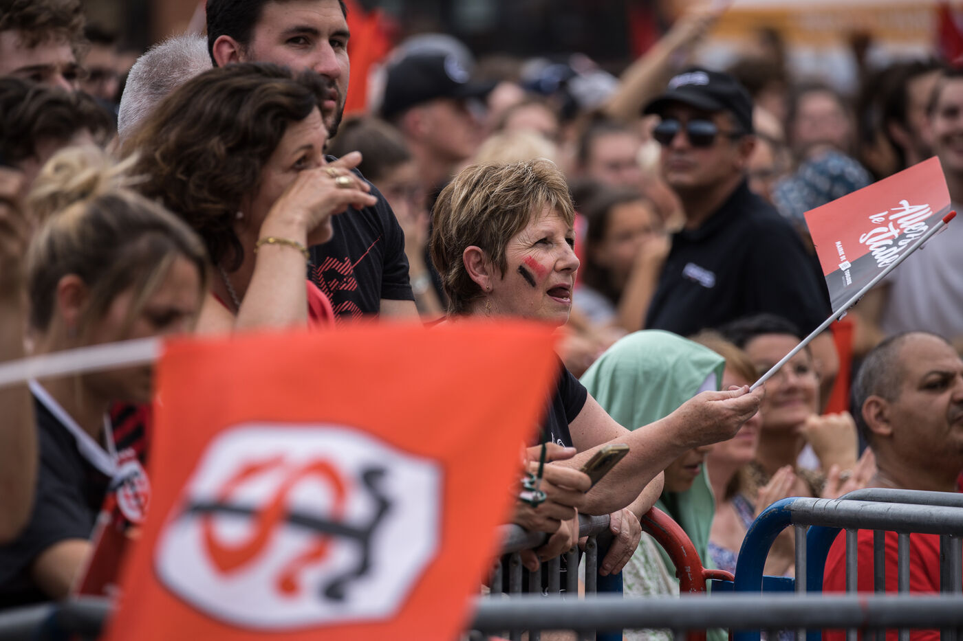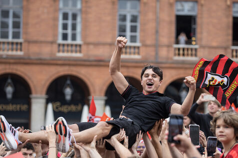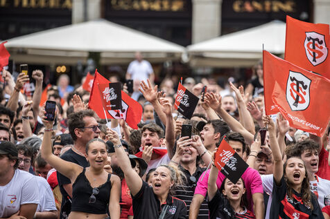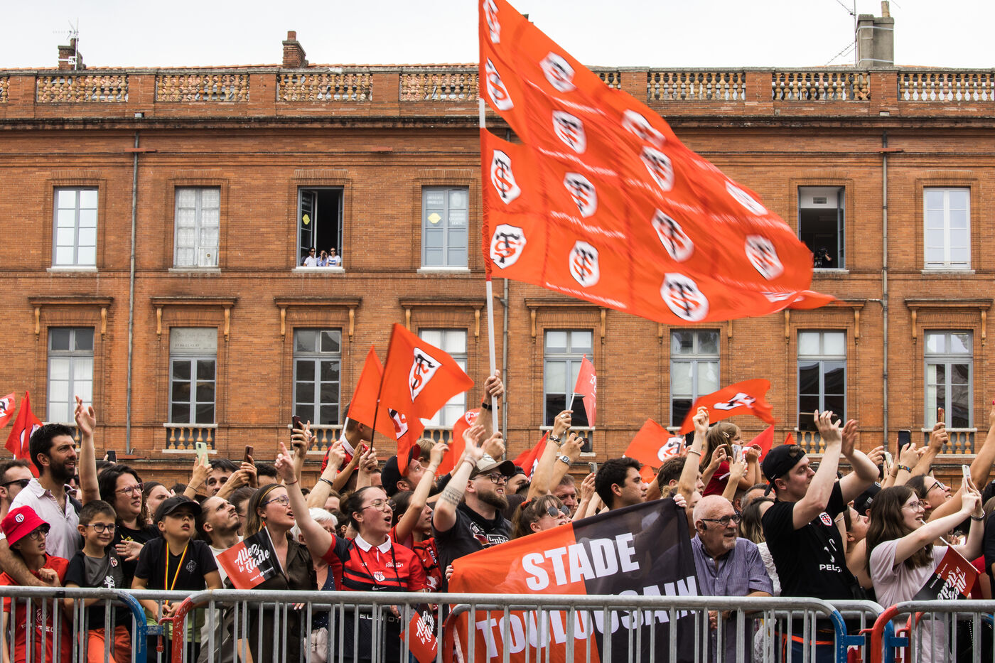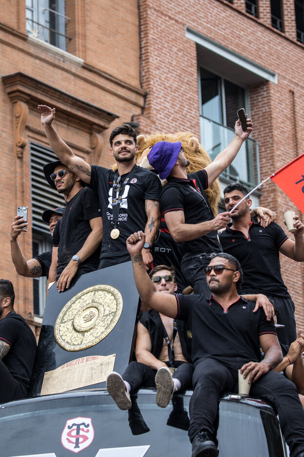 Romain Ntamack avec les joueurs du Stade Toulousain celebrent leur victoire en finale de Top14 contre la Rochelle avec les supporters en ramenant le bouclier de Brennus Place du Capitole.