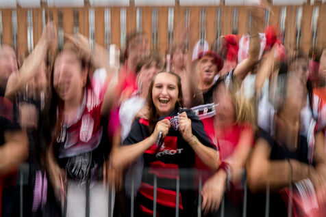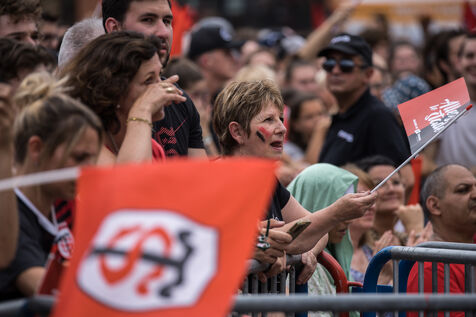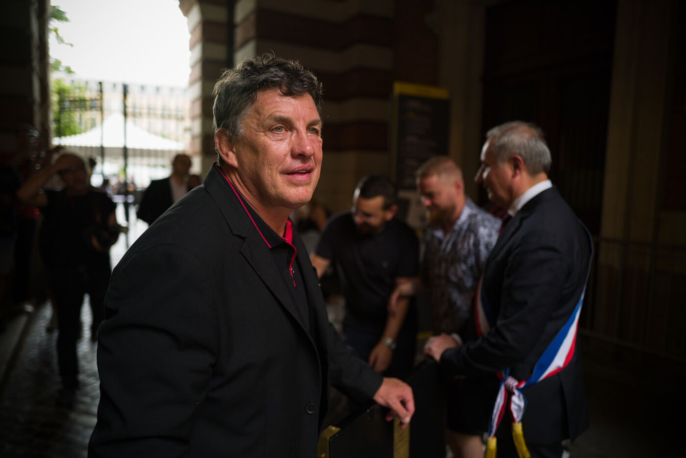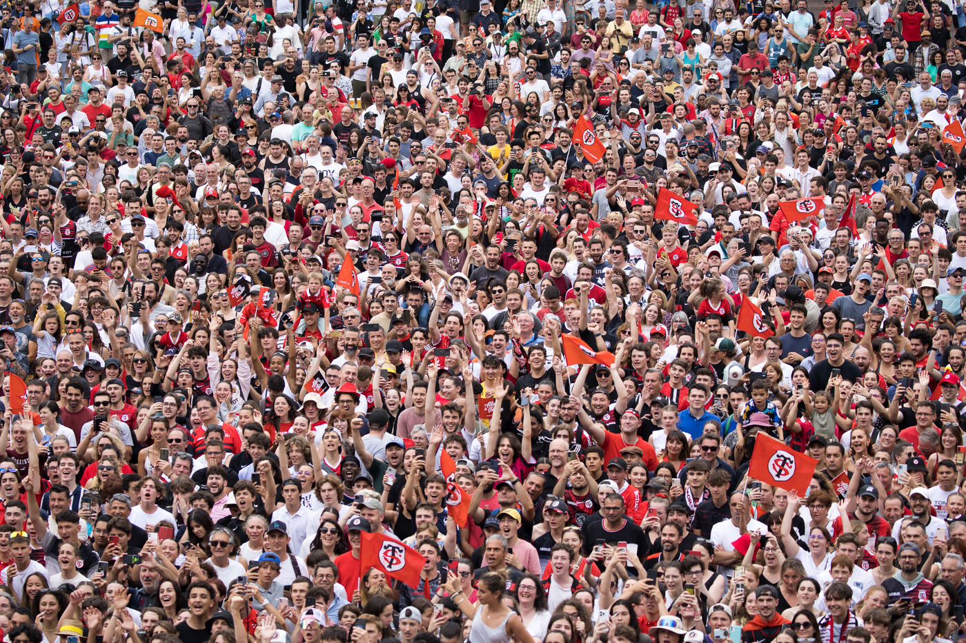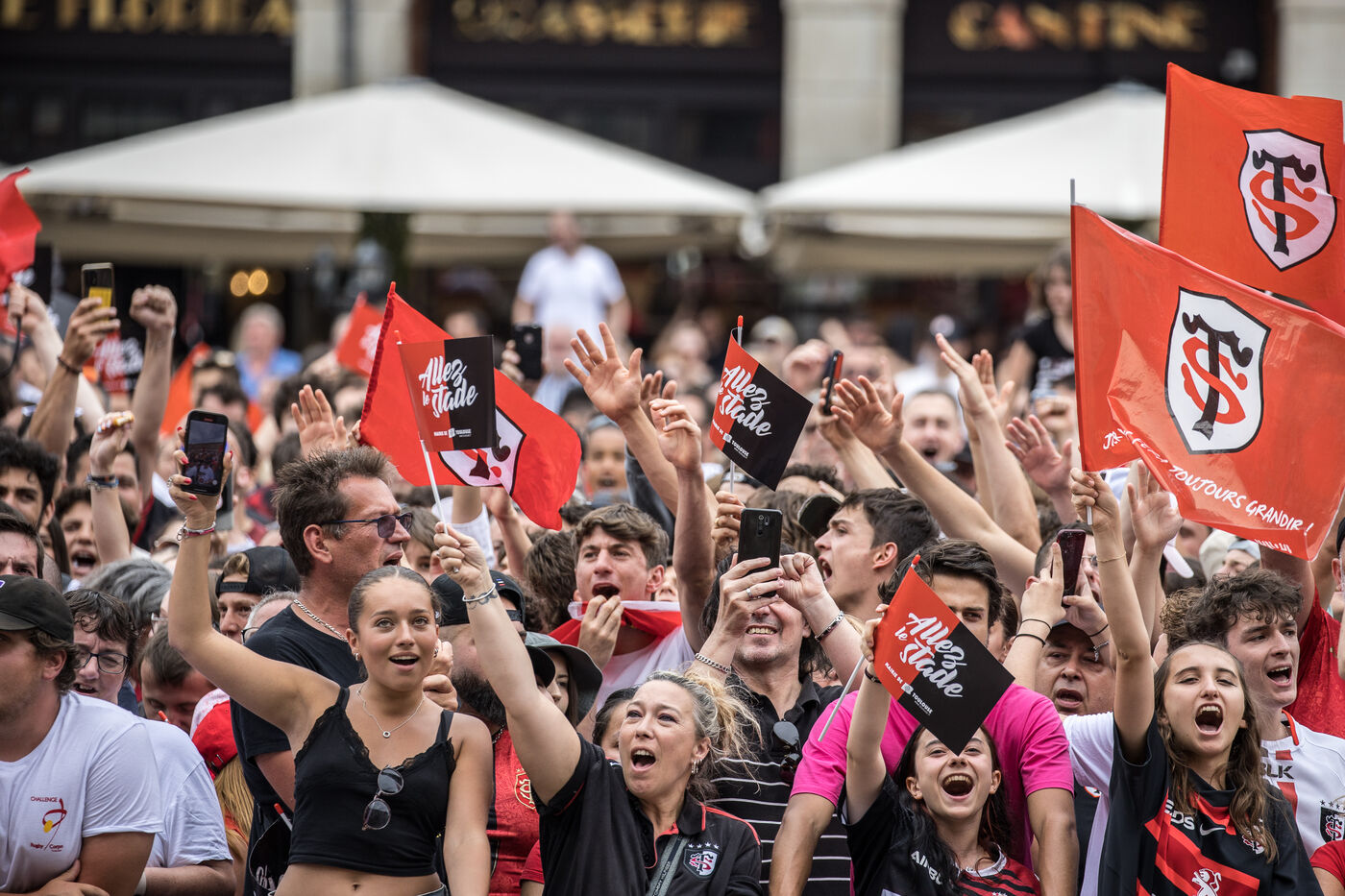 France, Toulouse, 2023-06-18. Romain Ntamack (C) with the Stade Toulousain players celebrate their victory in the Top14 final against La Rochelle with the supporters bringing back the shield from Brennus Place du Capitole.