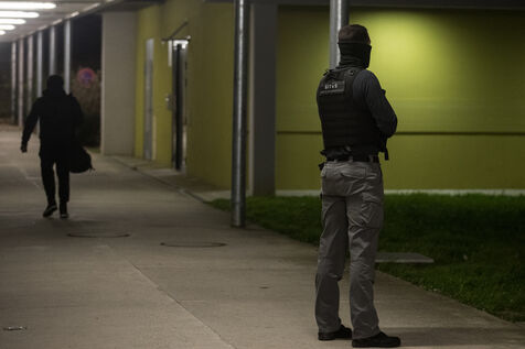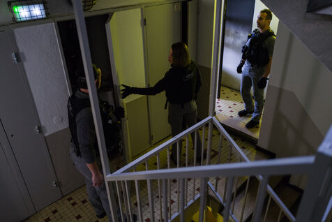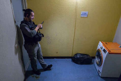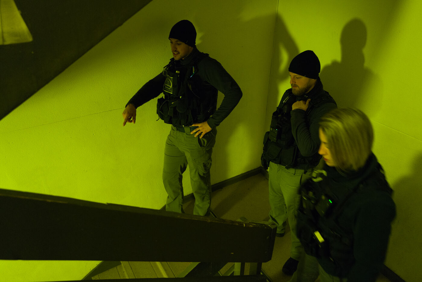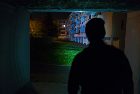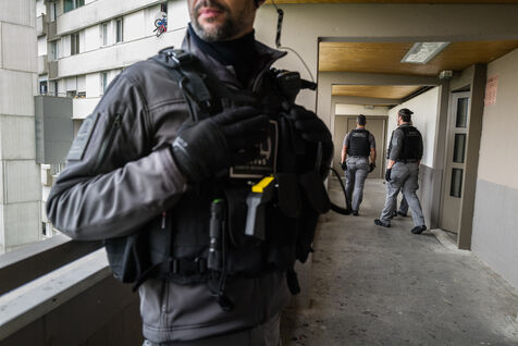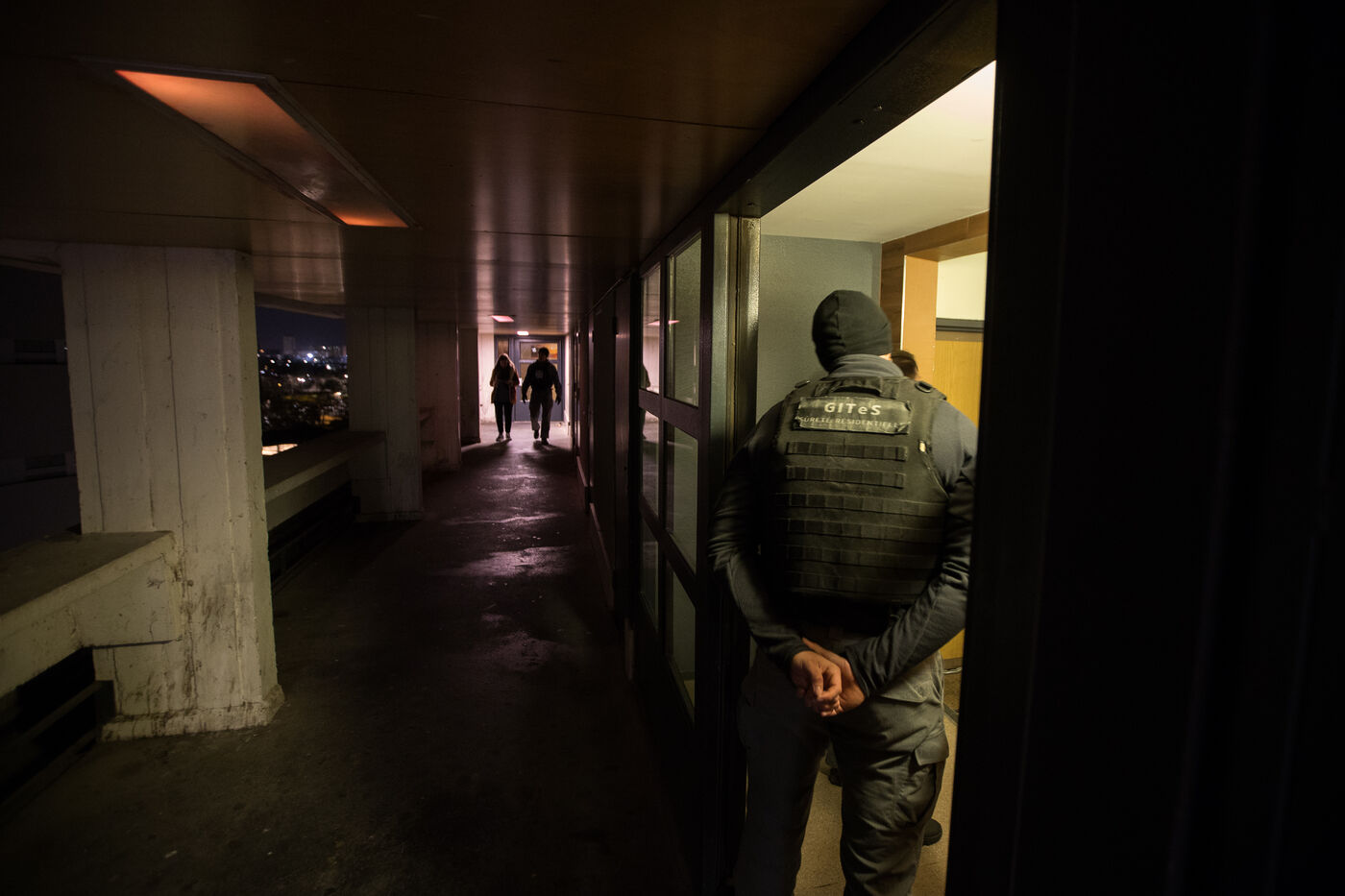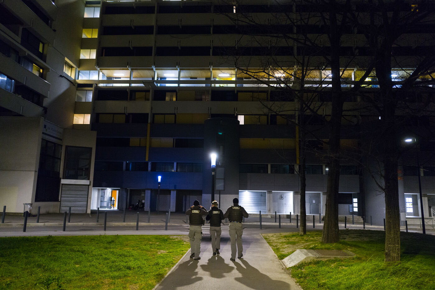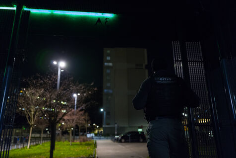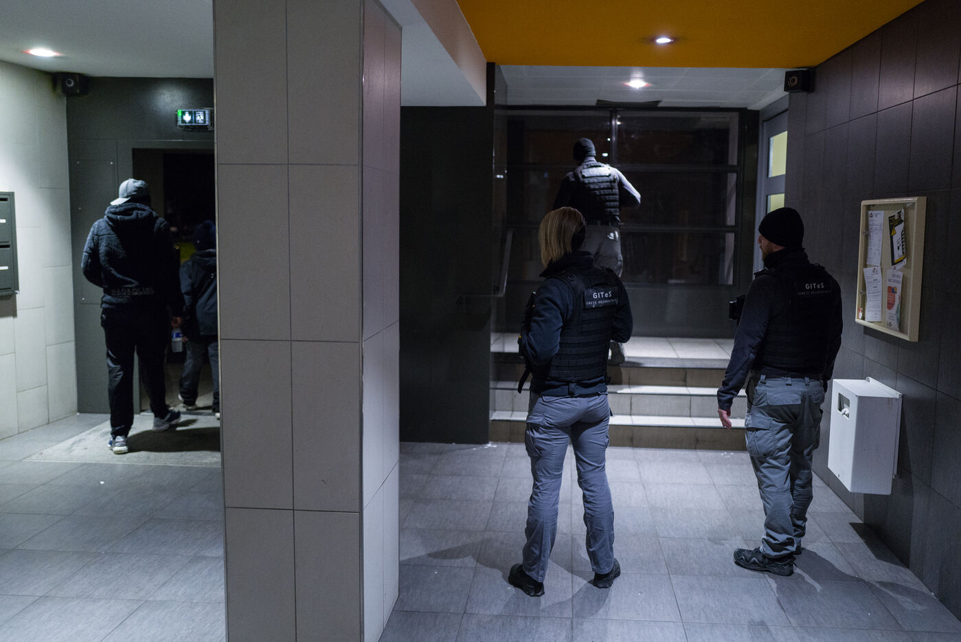 FRANCE, Toulouse, 2023-02-14. Des salariés du Groupement interquartiers de tranquillité et de sûreté(GITeS) ont en charge d'assurer la tranquilité des immeubles confiés par diffèrents bailleurs sociaux. Durant leurs patrouilles, ils sont au contact des habitants pour plus de sécurité, ils ont comme mission de gêner le traffic de stupéfiant et s"assurent de la propreté des parties communes des immeubles HLM situés dans des quartiers sensibles comme le Mirail ou le quartier de Soupetard.