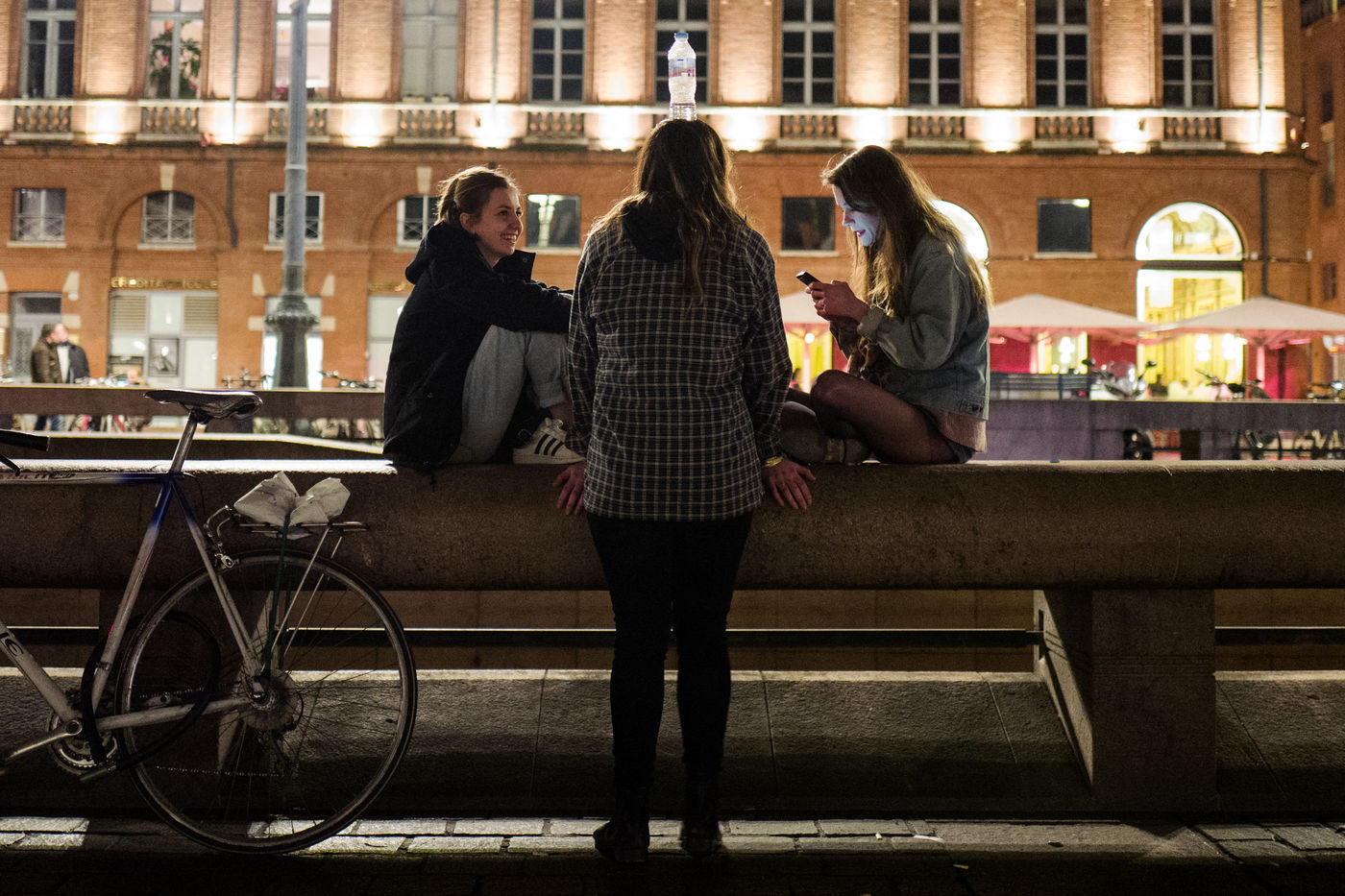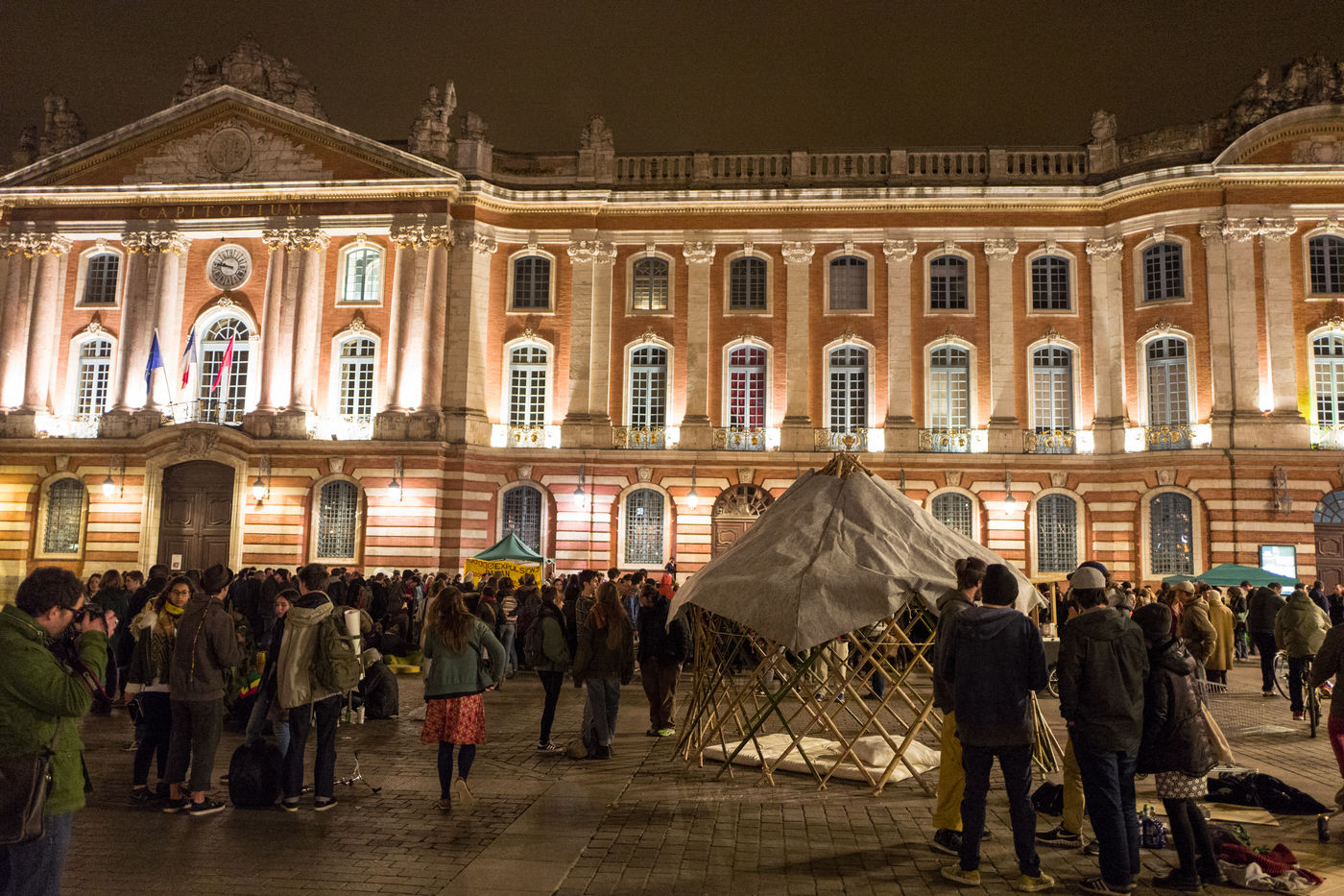 Rassemblement NUIT DEBOUT sur la place du Capitole. Depuis le 31 mars des personnes se sont installées sur différentes grandes places dans des villes de l'hexagone. Ces rassemblements pacifiques, appellés NUIT DEBOUT sont ouverts et populaires, ils visent à réinvestir l'espace public pour échanger, débattre et construire, la Place du Capitole est occupée depuis le 5 avril. 6/04/2016, Toulouse-France.