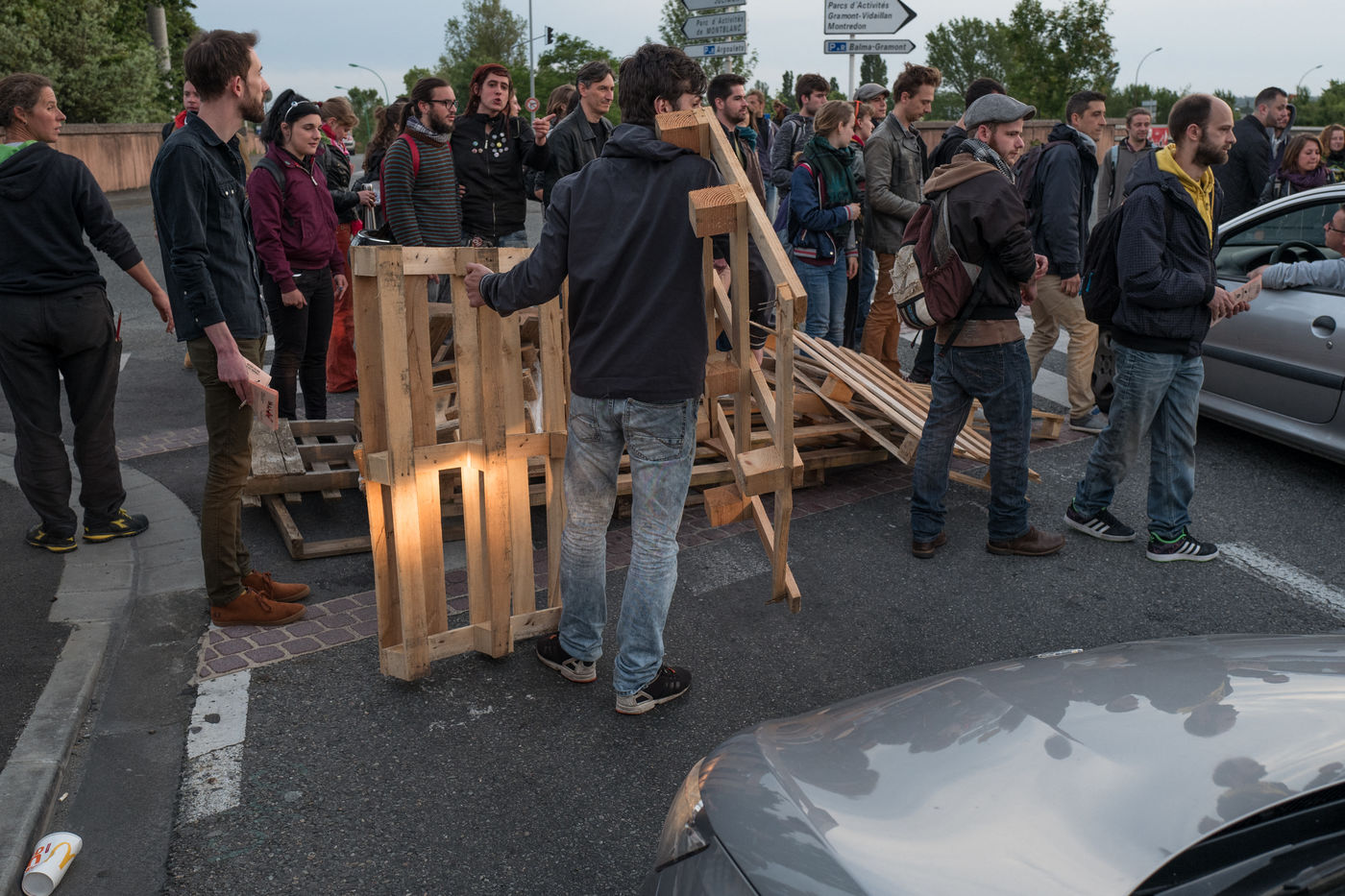 Très tôt le matin, plusieurs dizaines de manifestants, notamment du mouvement Nuit Debout, ont effectué des barrages filtrants aux sorties de rocade comme ici à Balma-Gramont pour dénoncer la loi Travail voulue par le gouvernement de Manuel Valls et de sa ministre du travail Myriam El-Khomri. De nombreux ralentissements et bouchons ont été enregistré alors que devait se tenir la grande manifestation à l?appel de l?intersyndicale dans l?après-midi.