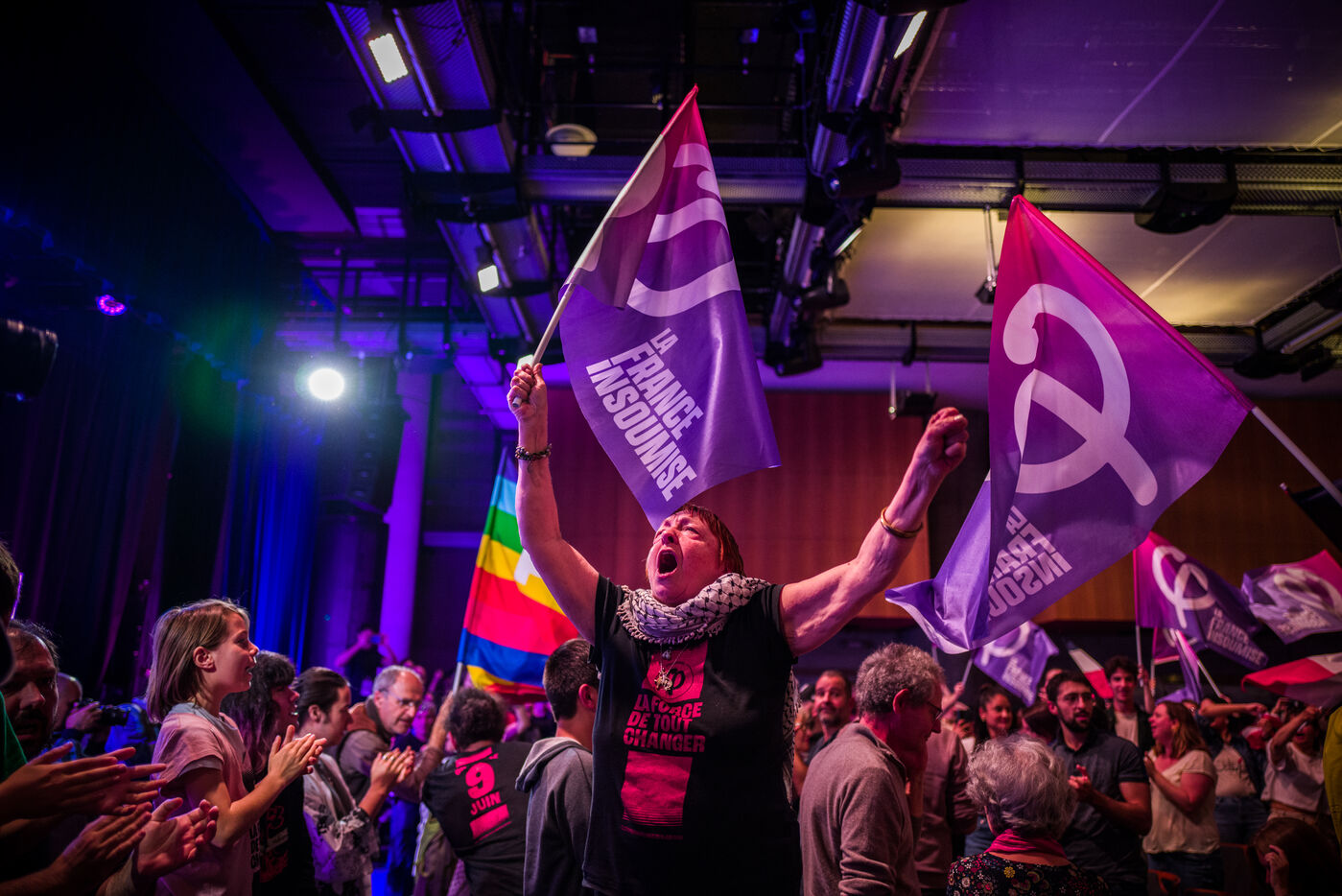 Ambiance avec les militants lors du meeting de Manon Aubry, candidate La France Insoumise (LFI) aux elections europeennes. Les prochaines elections europeennes auront lieu dans les 27 etats membres de l Union europeenne, en France, elles auront lieu le 9 juin.