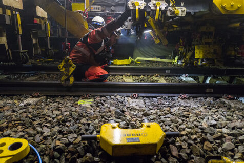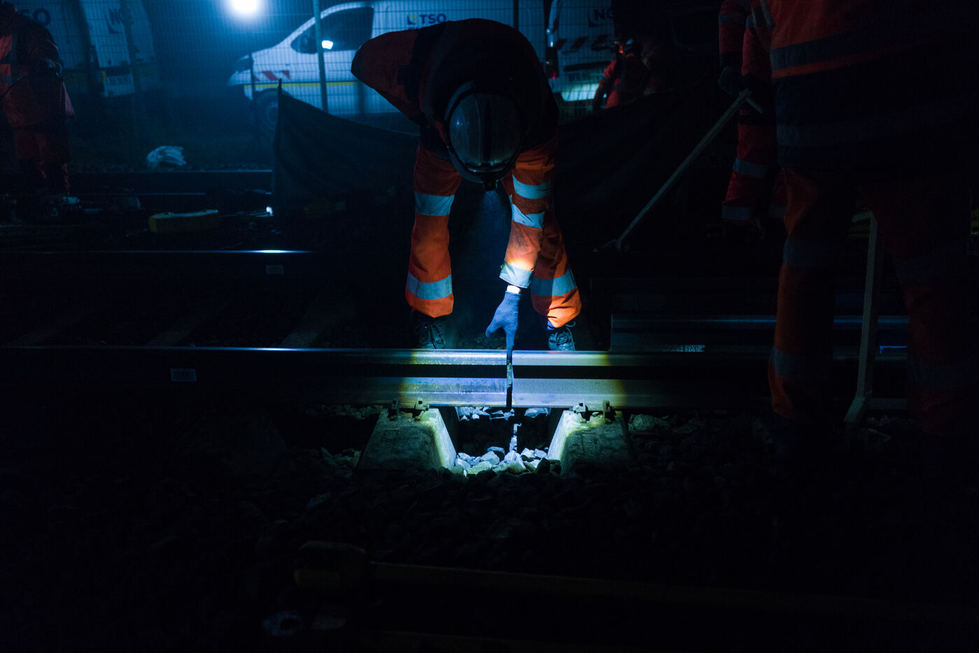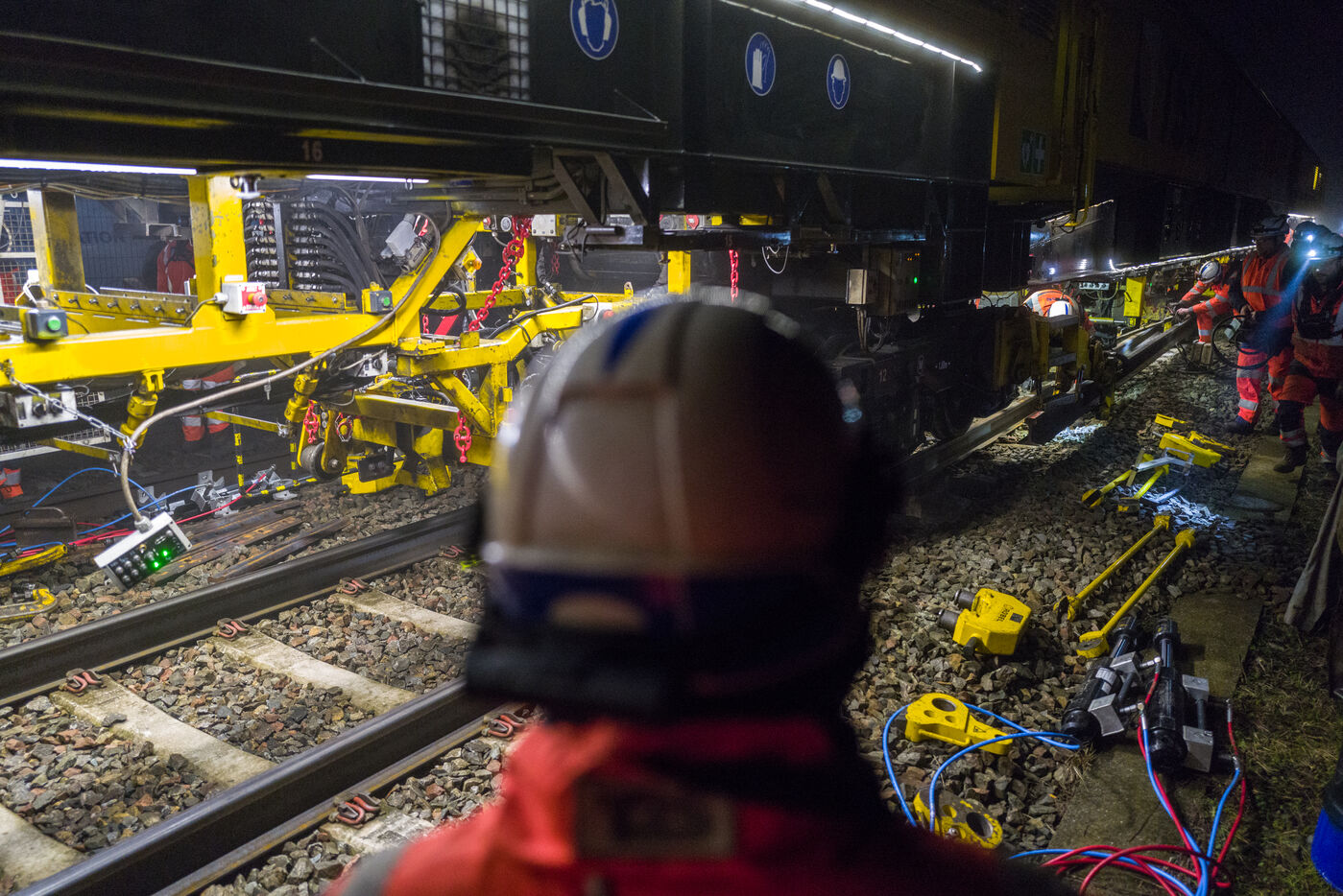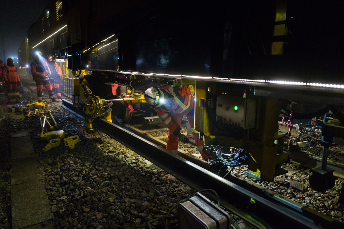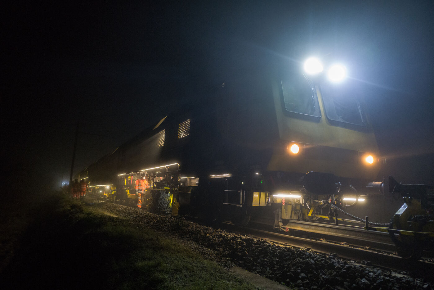 France, Baziege, 2025-01-17. SNCF Reseau is carrying out a night-time construction site on the railway between Toulouse and Castelnaudary in the south of France, using a factory train called the Boa and involving more than 100 employees.