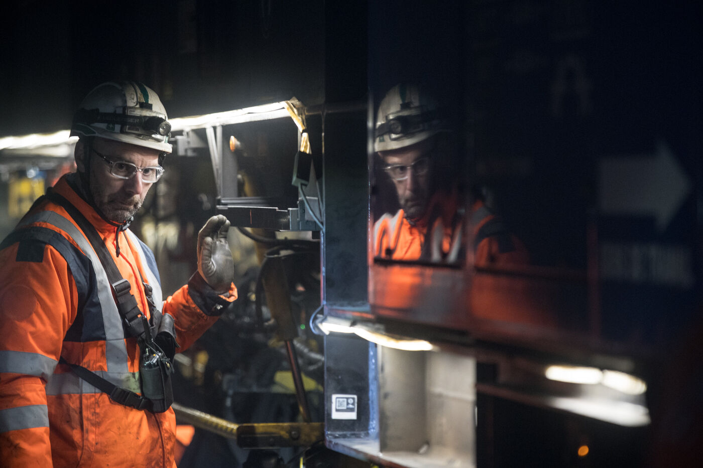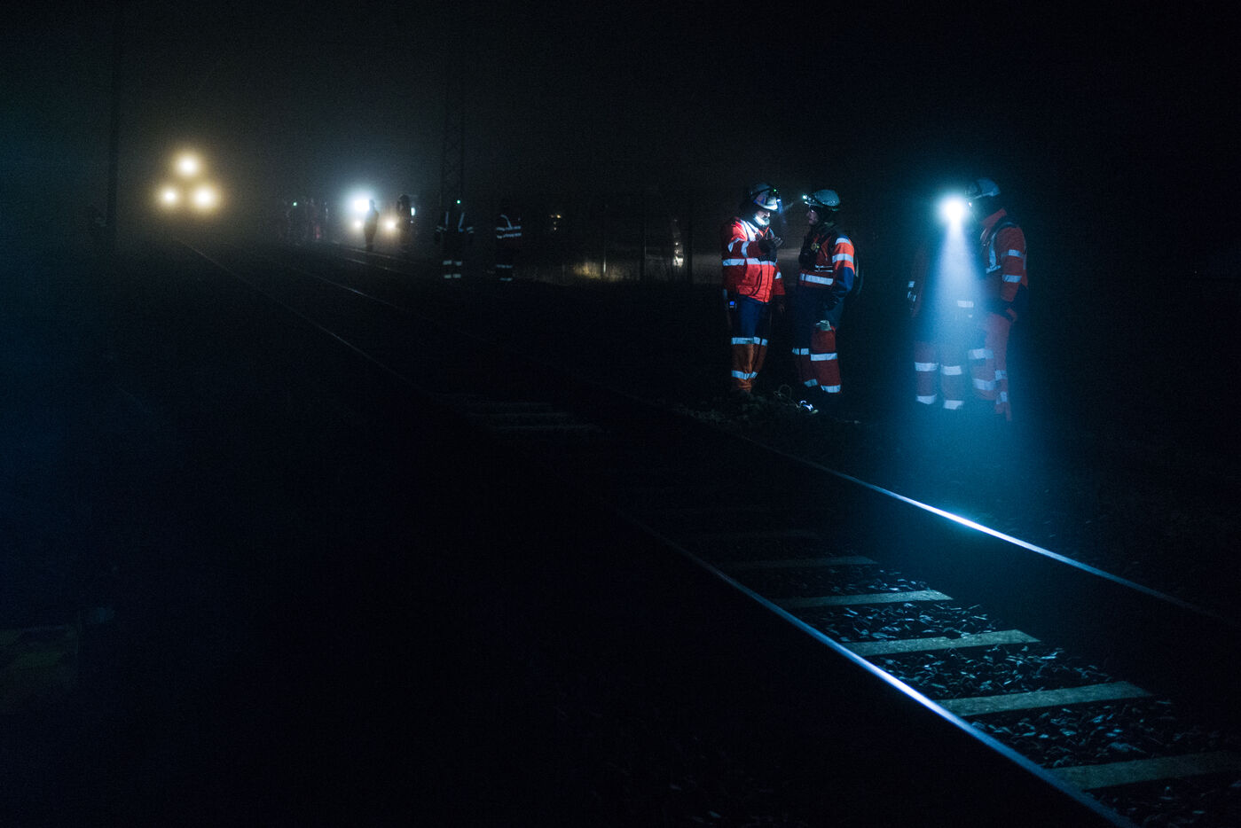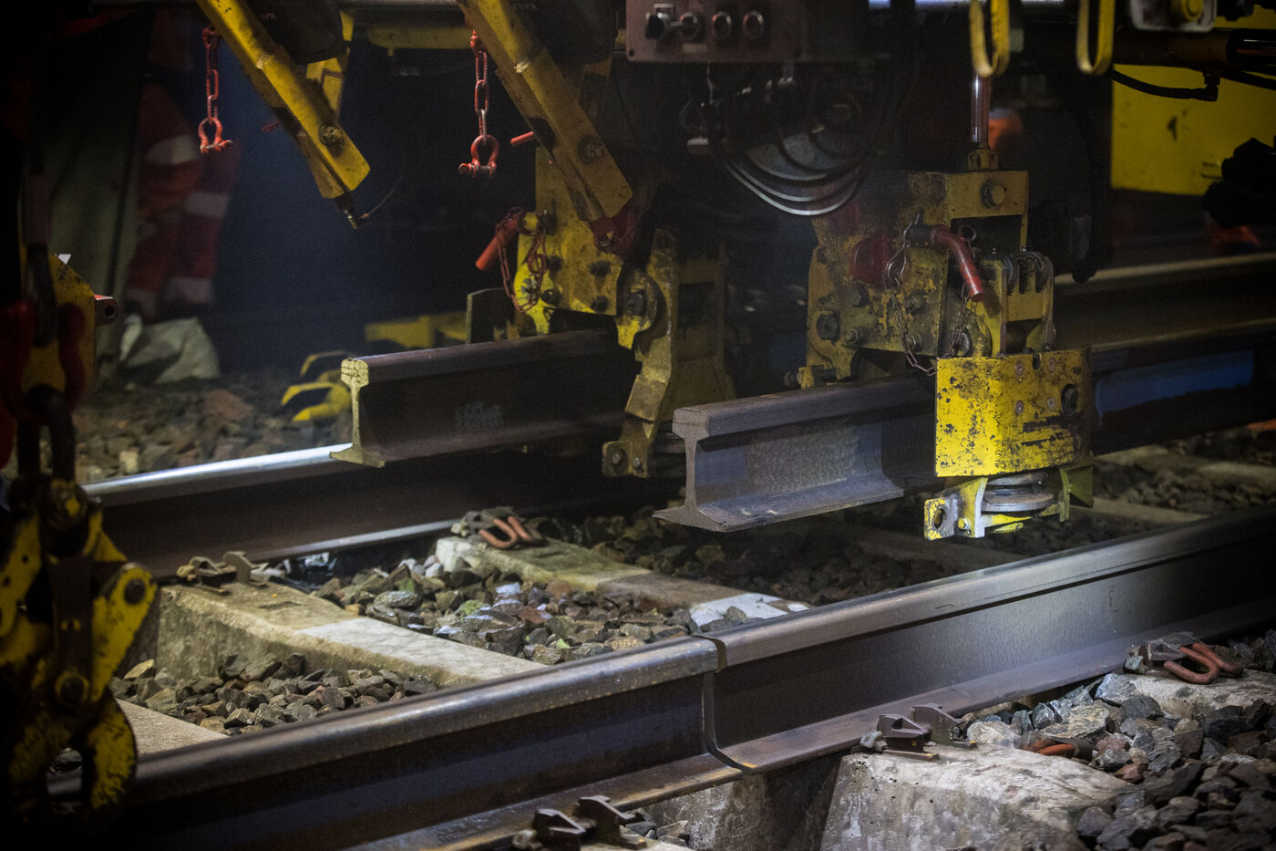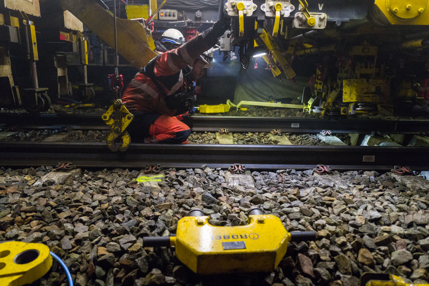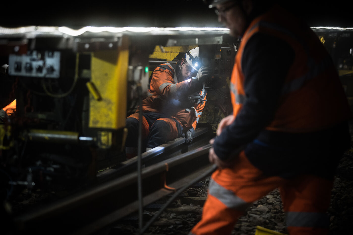 France, Baziege, 2025-01-17. SNCF Reseau is carrying out a night-time construction site on the railway between Toulouse and Castelnaudary in the south of France, using a factory train called the Boa and involving more than 100 employees.