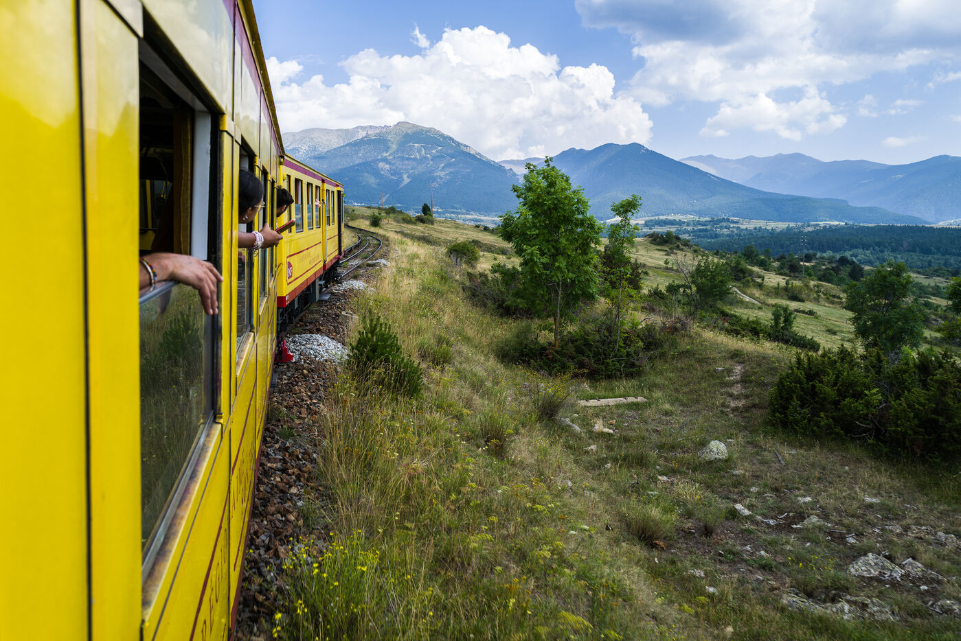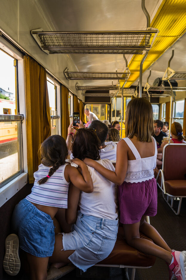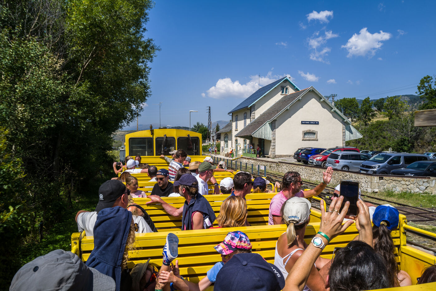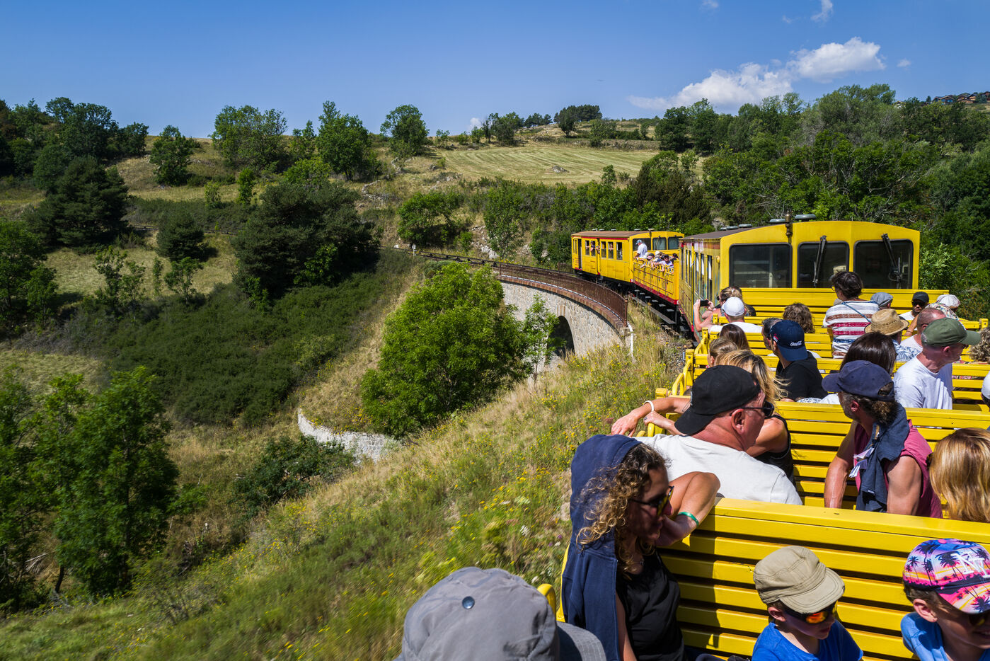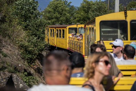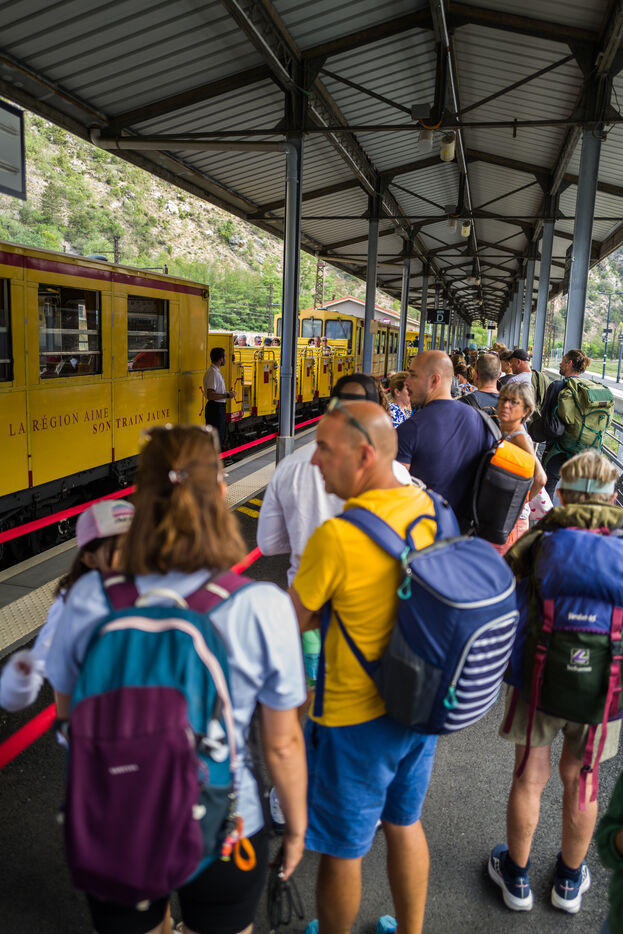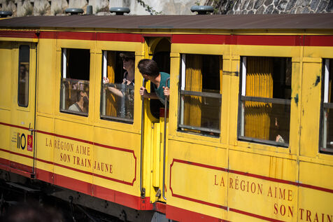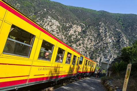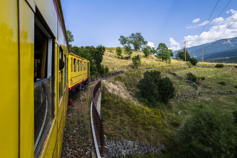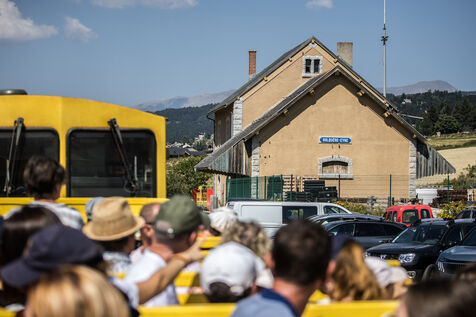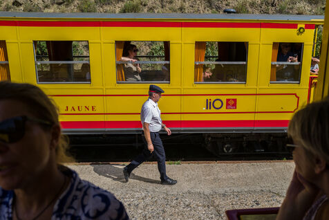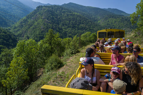 Tourists in the Yellow Train, also known as the Cerdagne line, this 62.5 km railway line in the Pyrénées-Orientales department connects Villefranche-Vernet-les-Bains station to Latour-de-Carol-Enveitg station via Font-Romeu.
