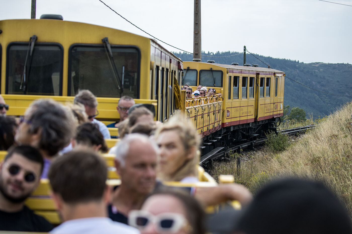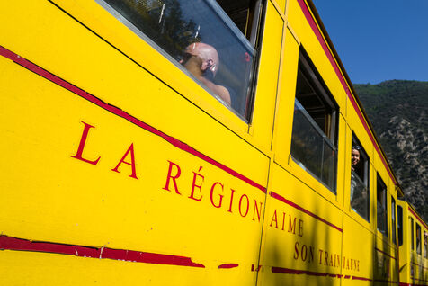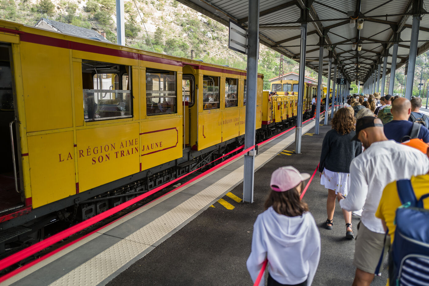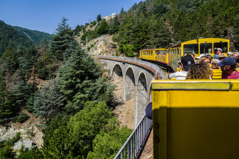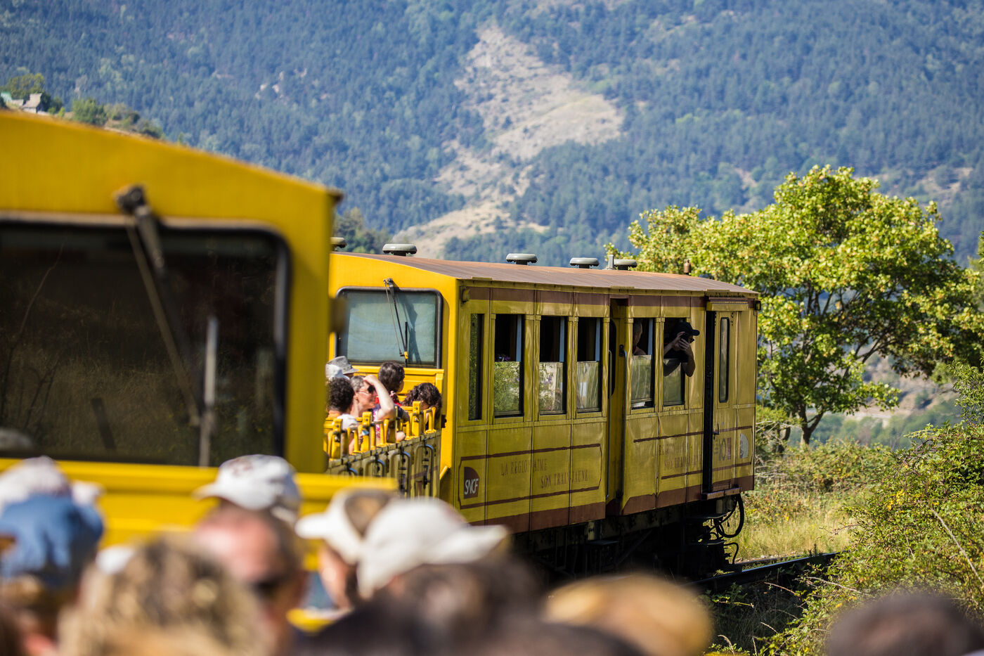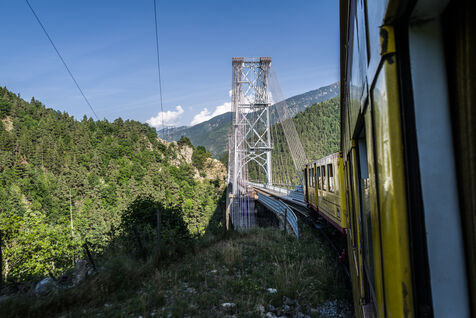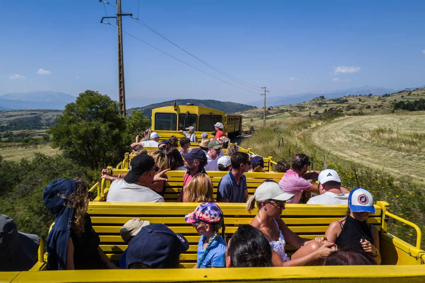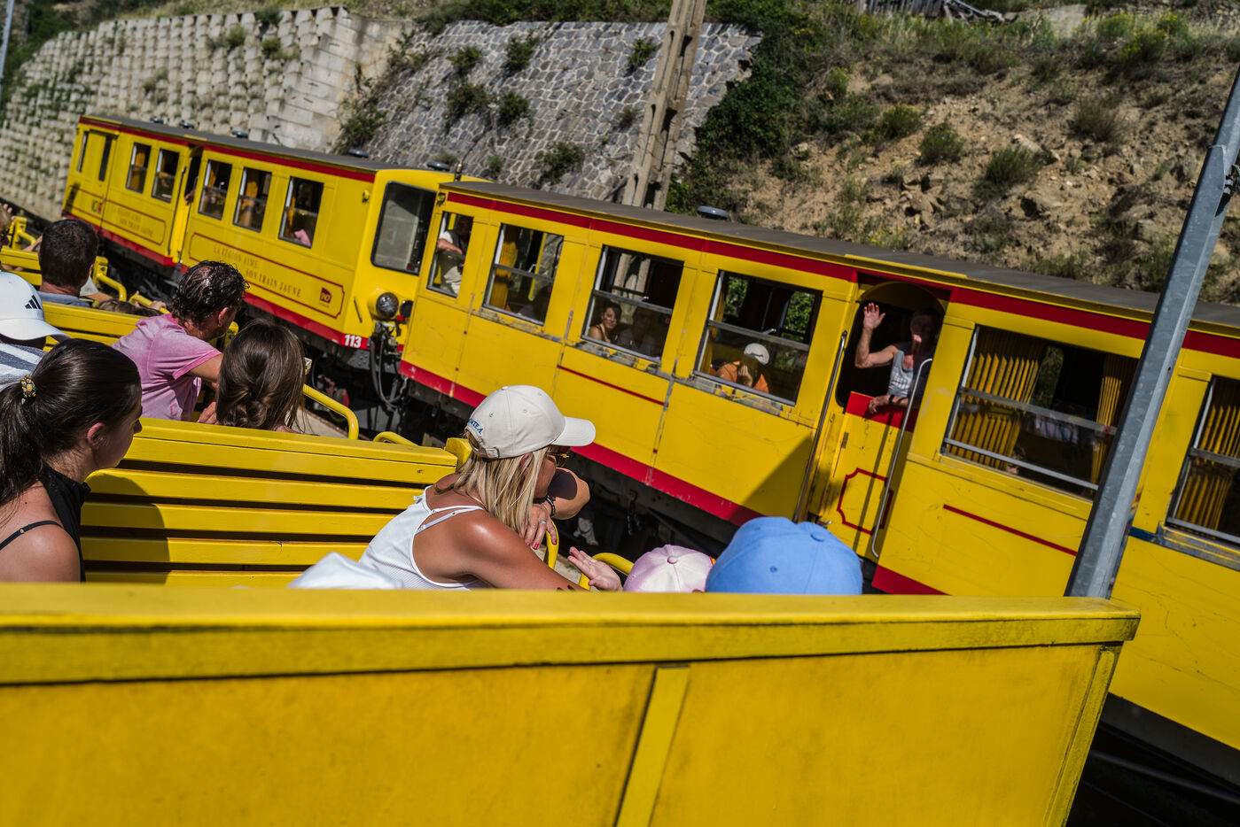 Tourists in the Yellow Train, also known as the Cerdagne line, this 62.5 km railway line in the Pyrénées-Orientales department connects Villefranche-Vernet-les-Bains station to Latour-de-Carol-Enveitg station via Font-Romeu.