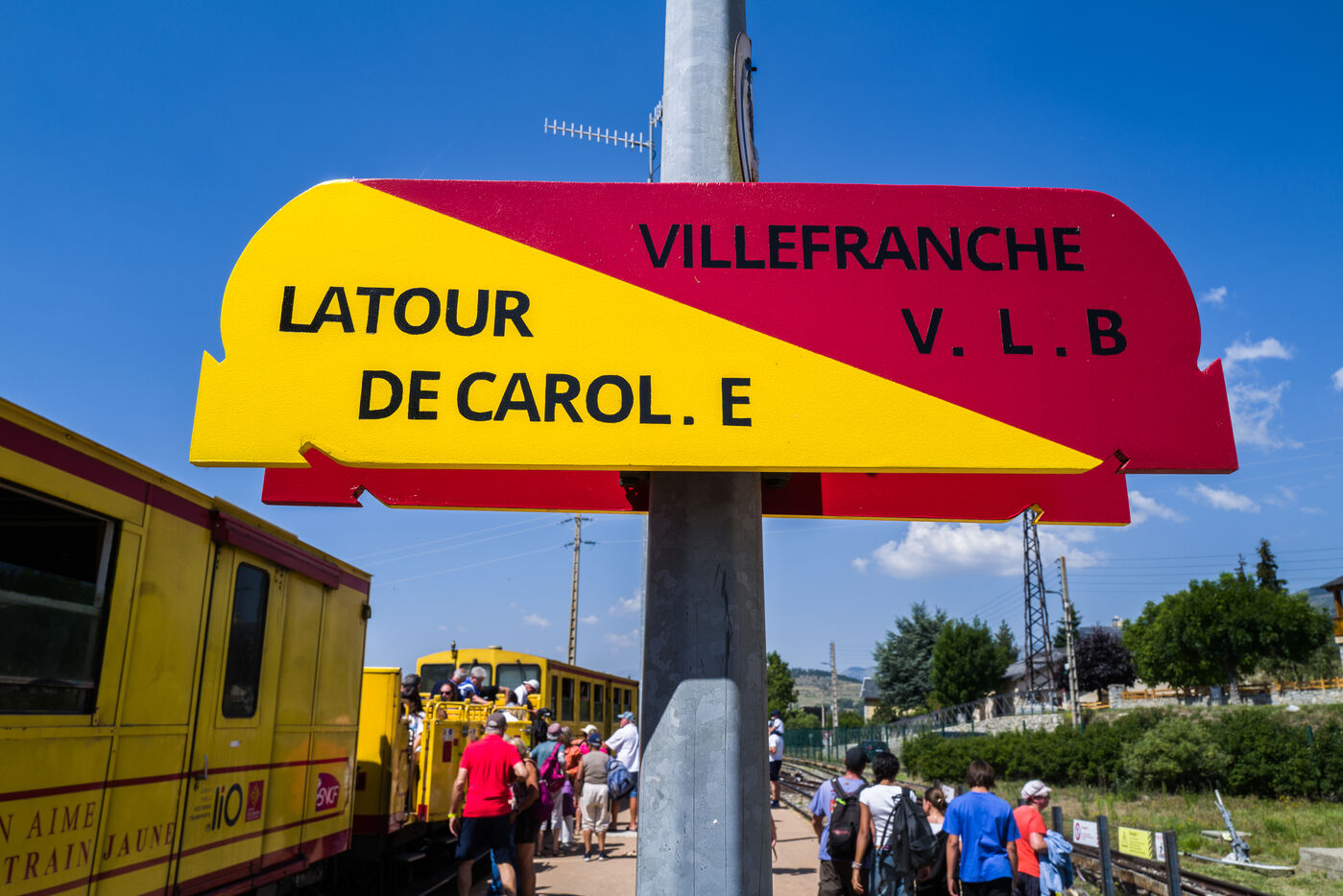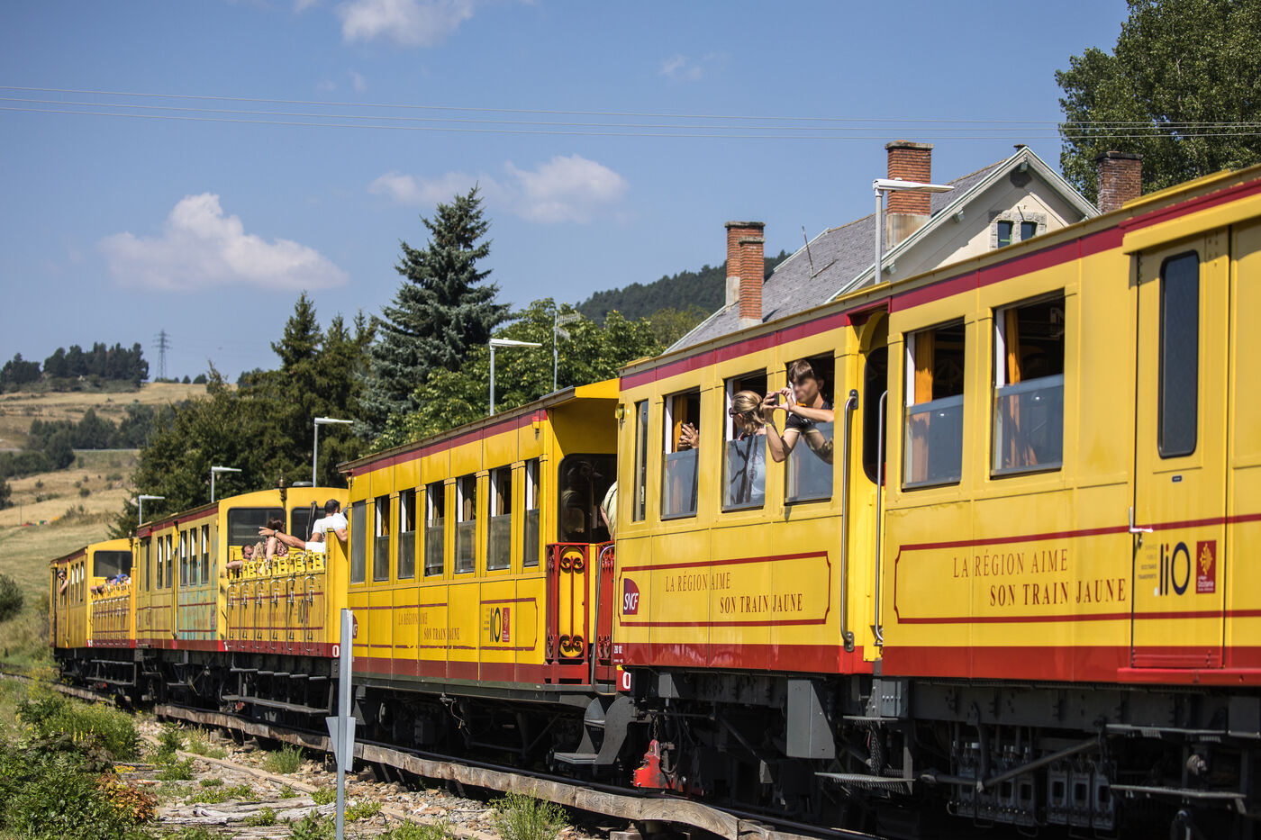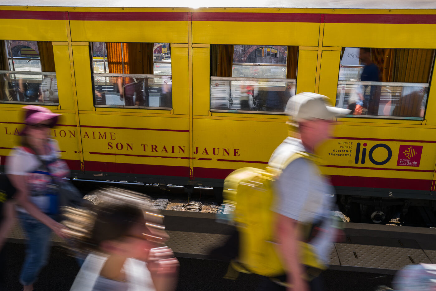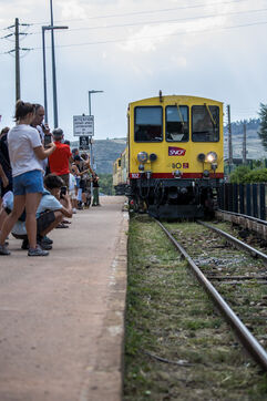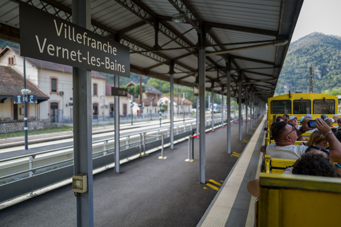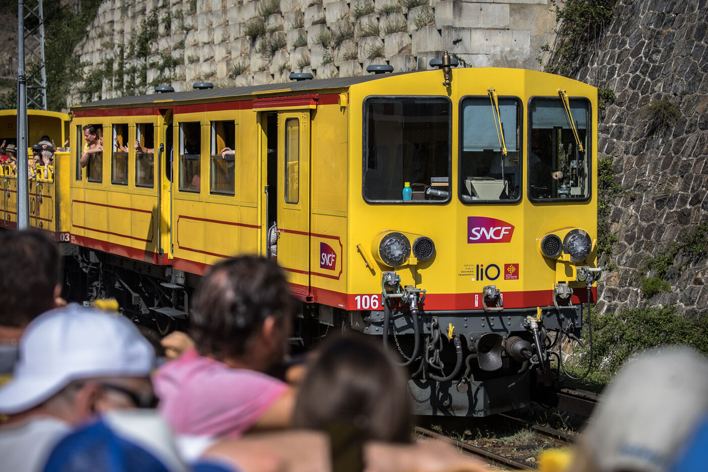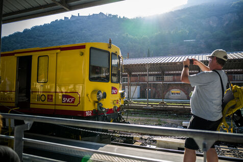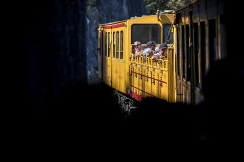 Tourists in the Yellow Train, also known as the Cerdagne line, this 62.5 km railway line in the Pyrénées-Orientales department connects Villefranche-Vernet-les-Bains station to Latour-de-Carol-Enveitg station via Font-Romeu.