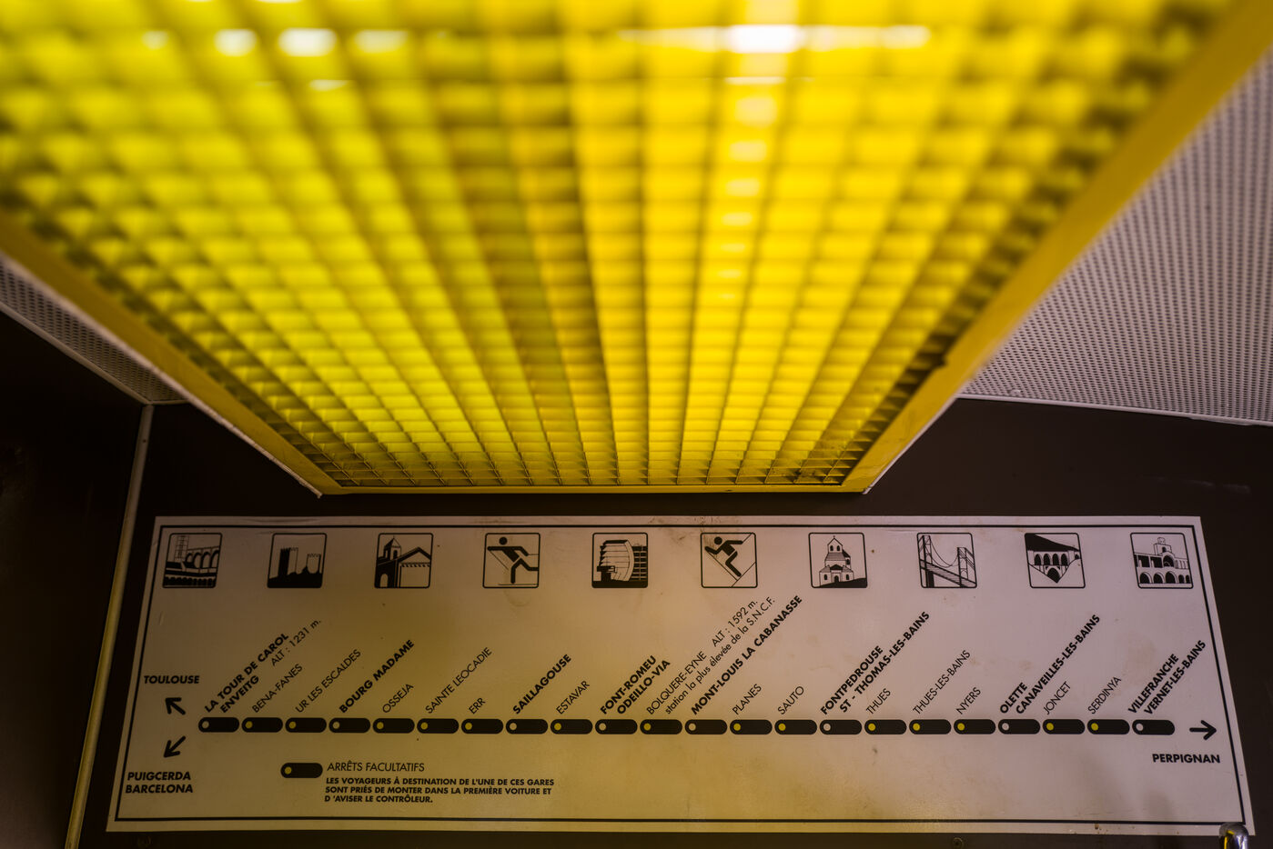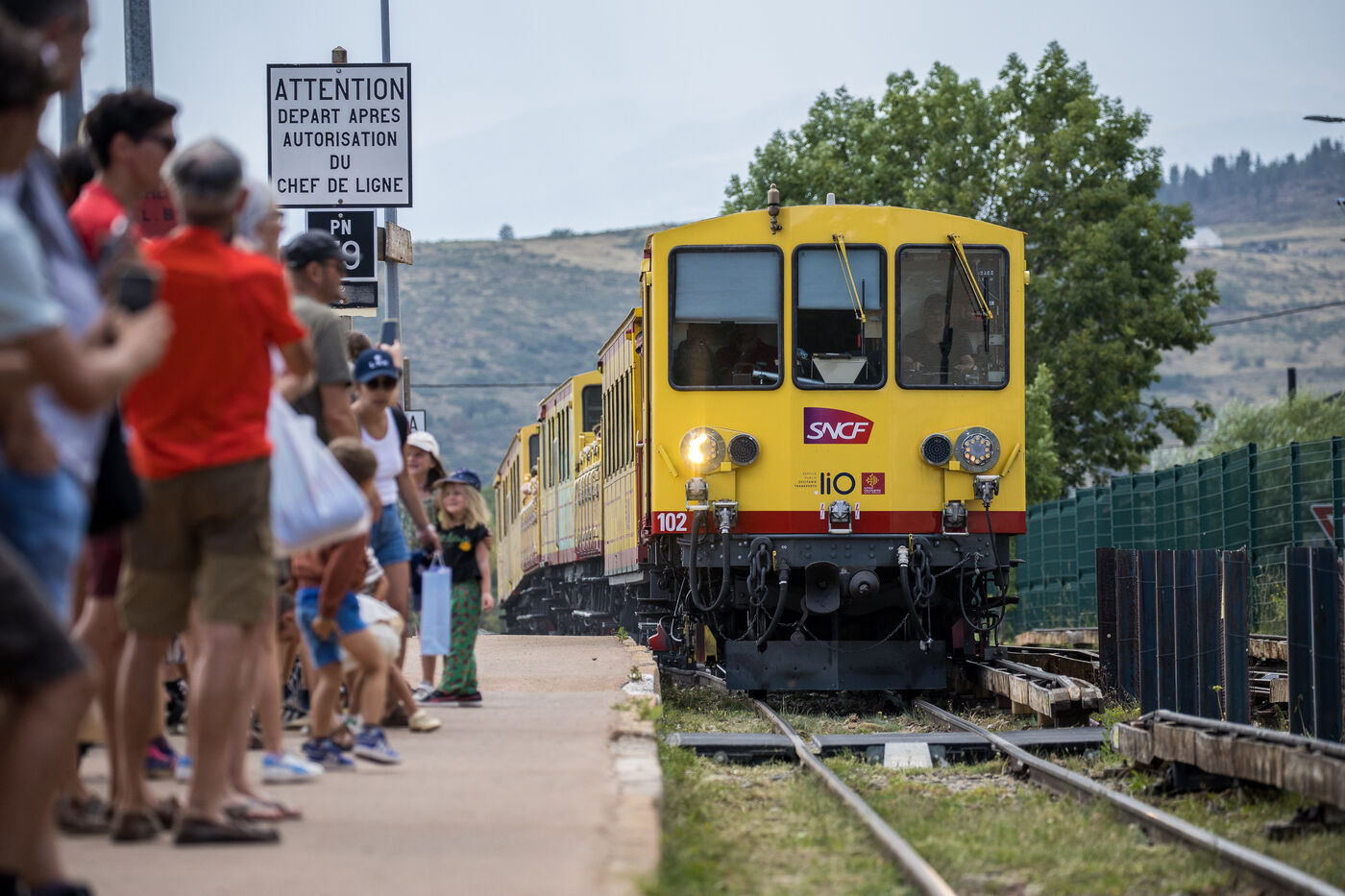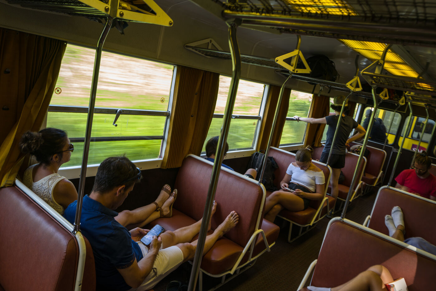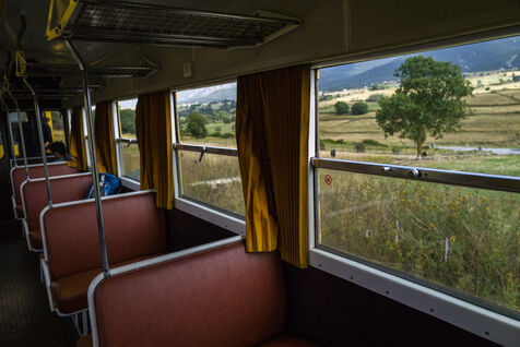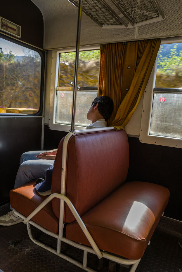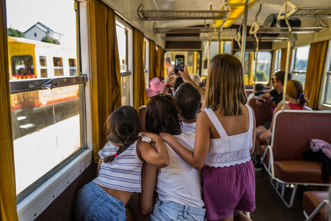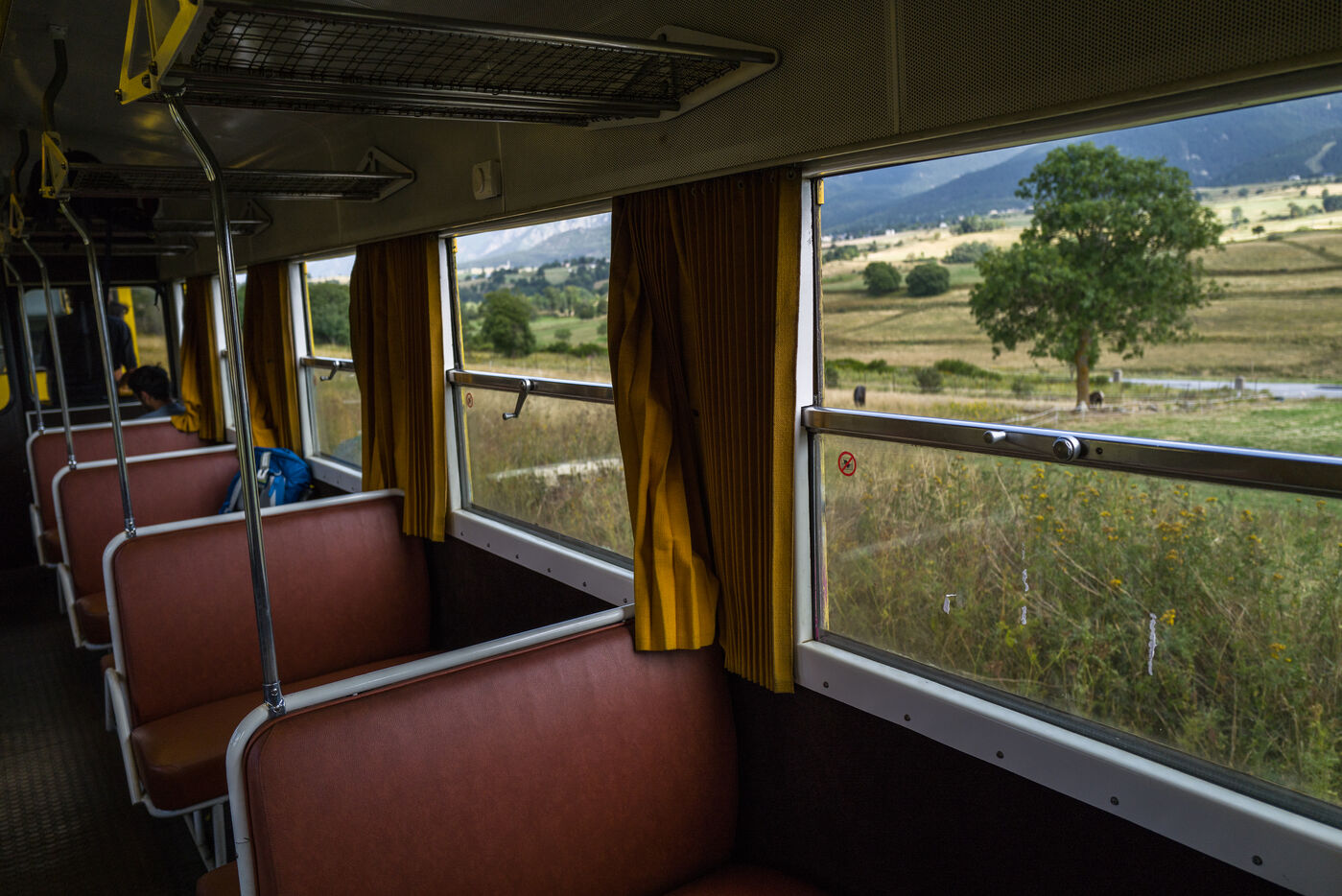 Tourists in the Yellow Train, also known as the Cerdagne line, this 62.5 km railway line in the Pyrénées-Orientales department connects Villefranche-Vernet-les-Bains station to Latour-de-Carol-Enveitg station via Font-Romeu.
